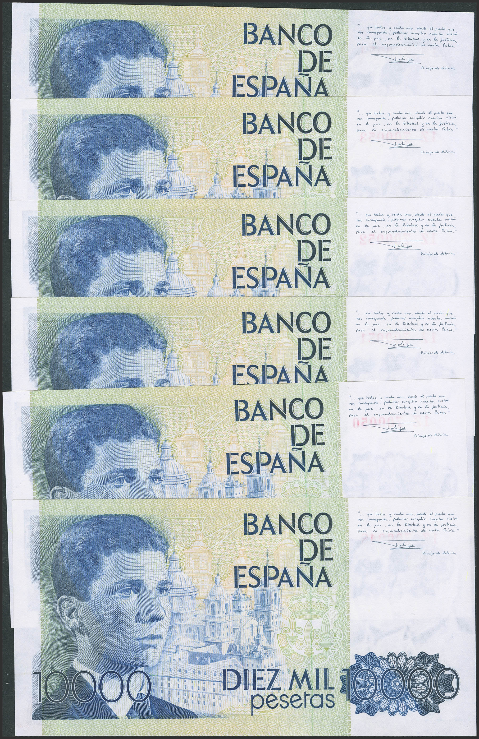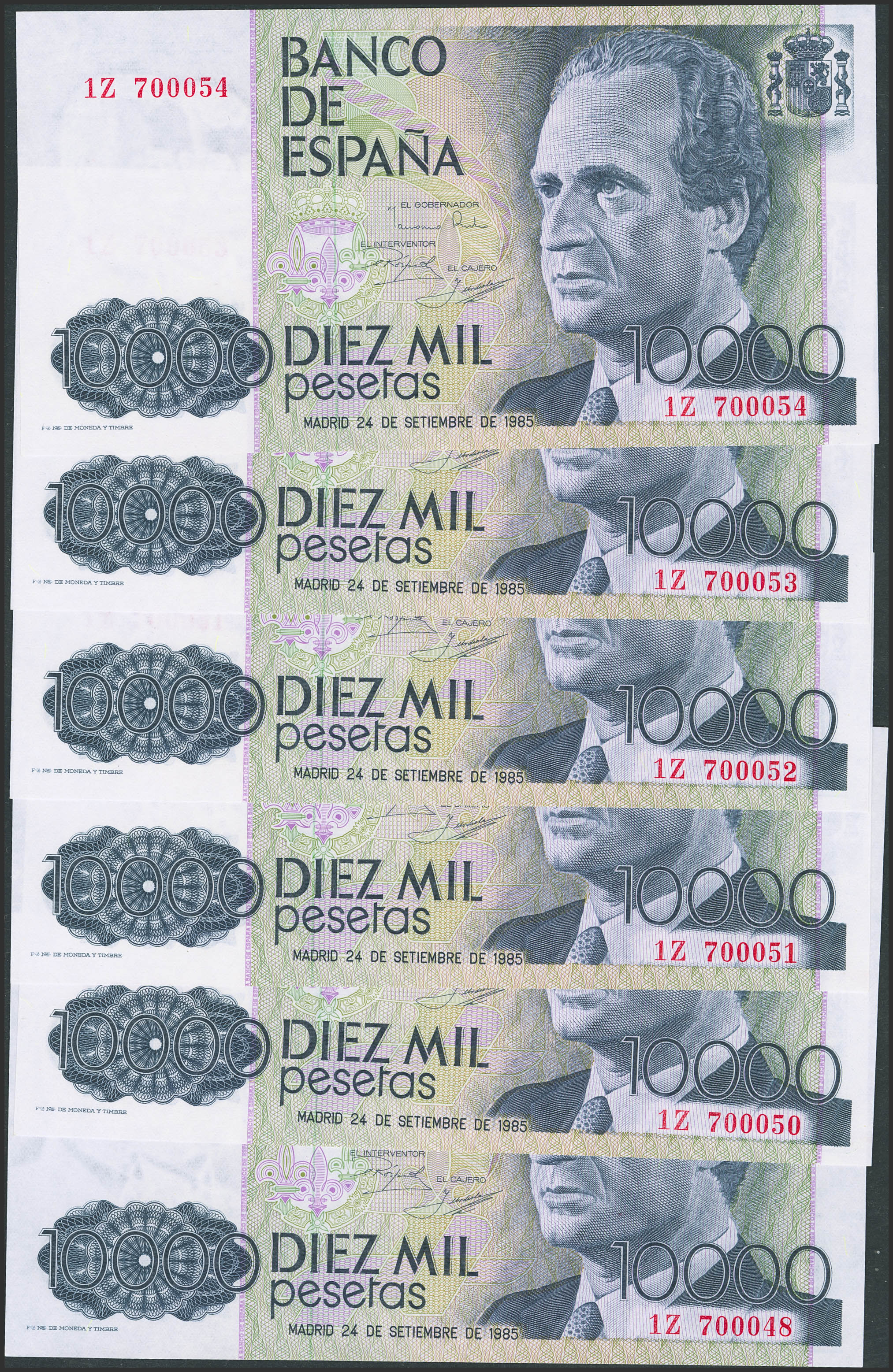 Conjunto de 6 billetes en tramos correlativos de 10000 Pesetas emitidos el 24 de Septiembre de 1985 y con la serie 1Z. (Edifil 2023: 481a). SC/SC-.