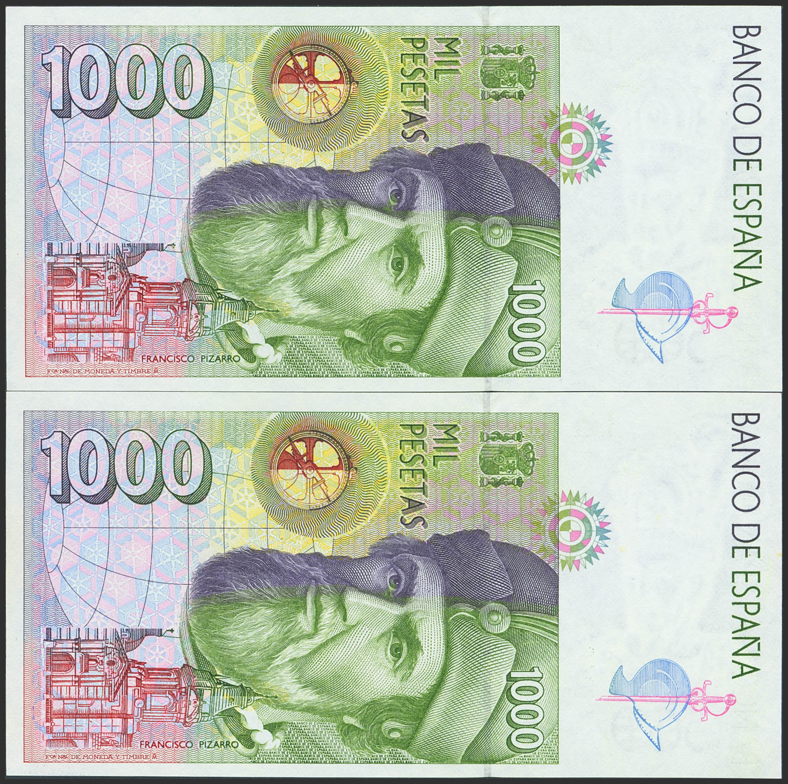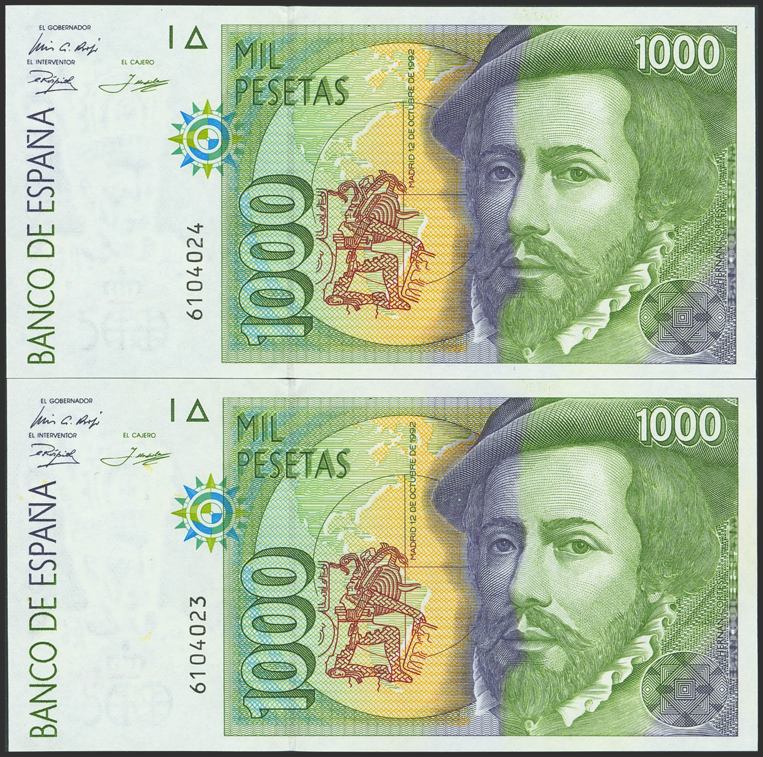 1000 Pesetas. 12 de Octubre de 1992. Pareja correlativa. Sin serie. (Edifil 2021: 483). SC.
