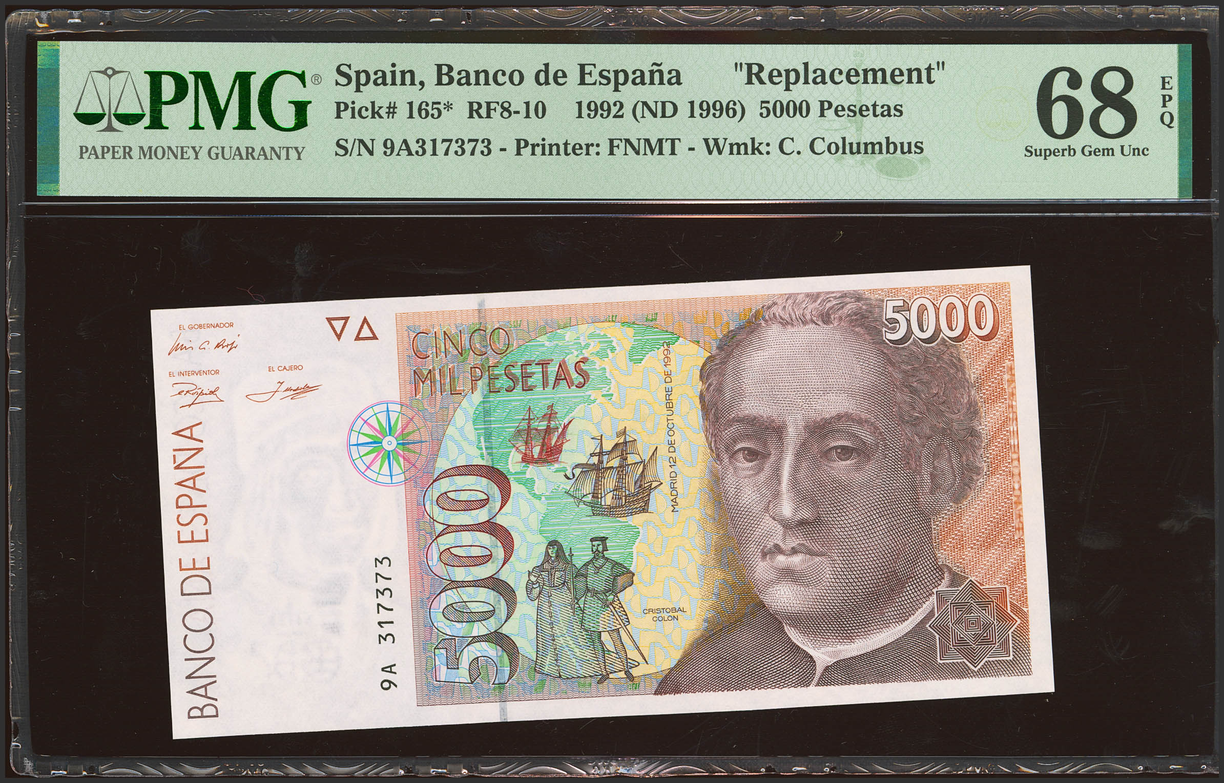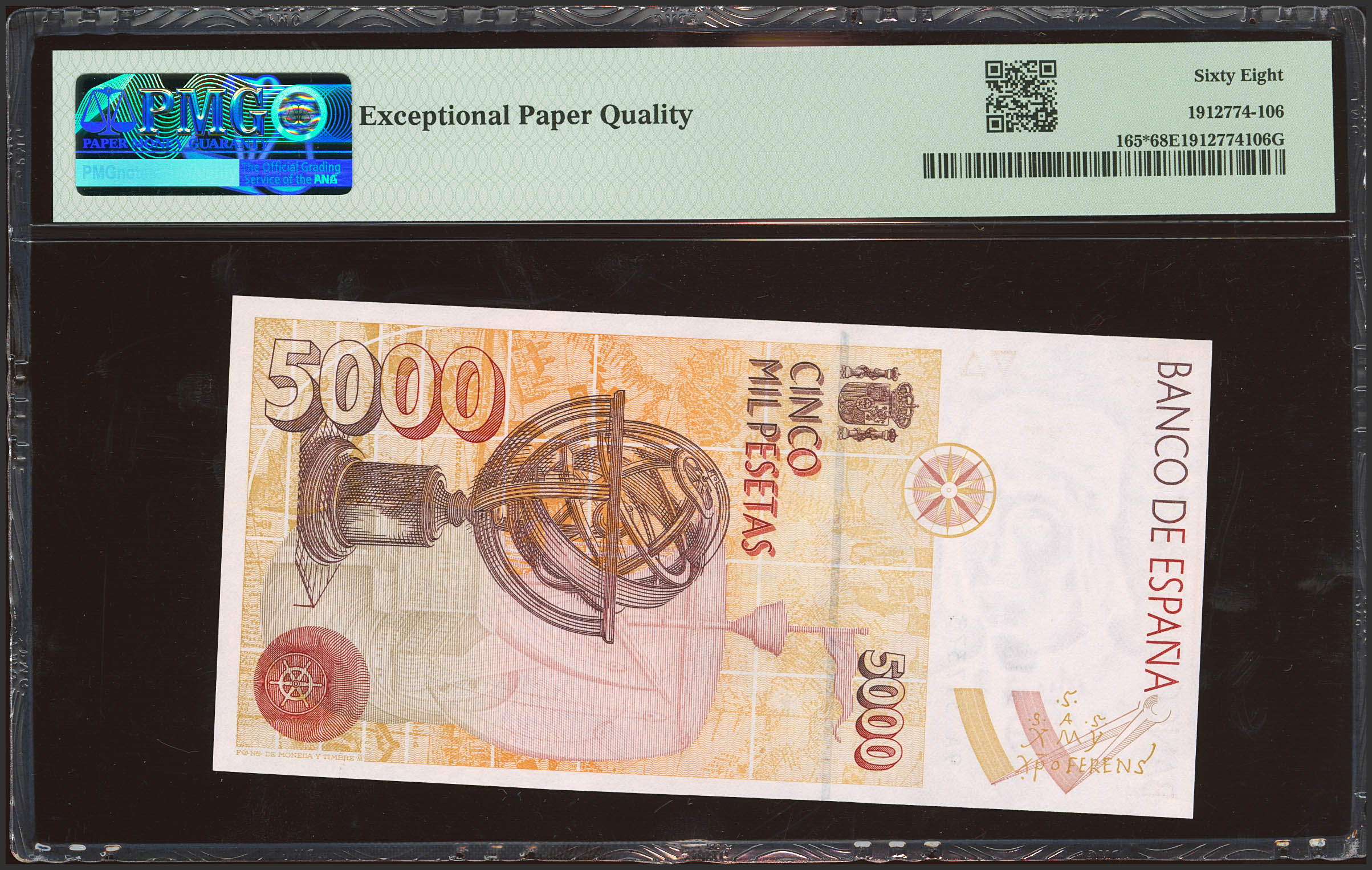 5000 Pesetas. 12 de Octubre de 1992. Serie especial 9A. (Edifil 2021: 484b, Pick: 165*). Rarísimo en esta excepcional calidad. SC. Encapsulado PMG68EPQ.