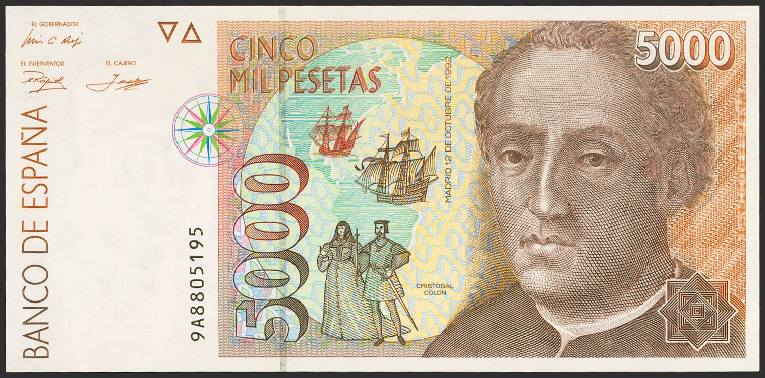 5000 Pesetas. 12 de Octubre de 1992. Serie especial 9A. (Edifil 2023: 484b). Raro y ondulación natural del proceso de fabricación (este es el único motivo de "quitarle" el SC) EBC+++.