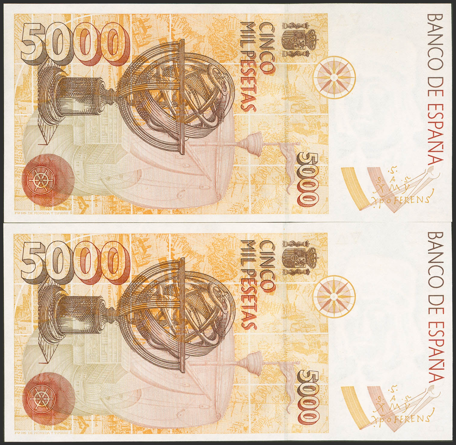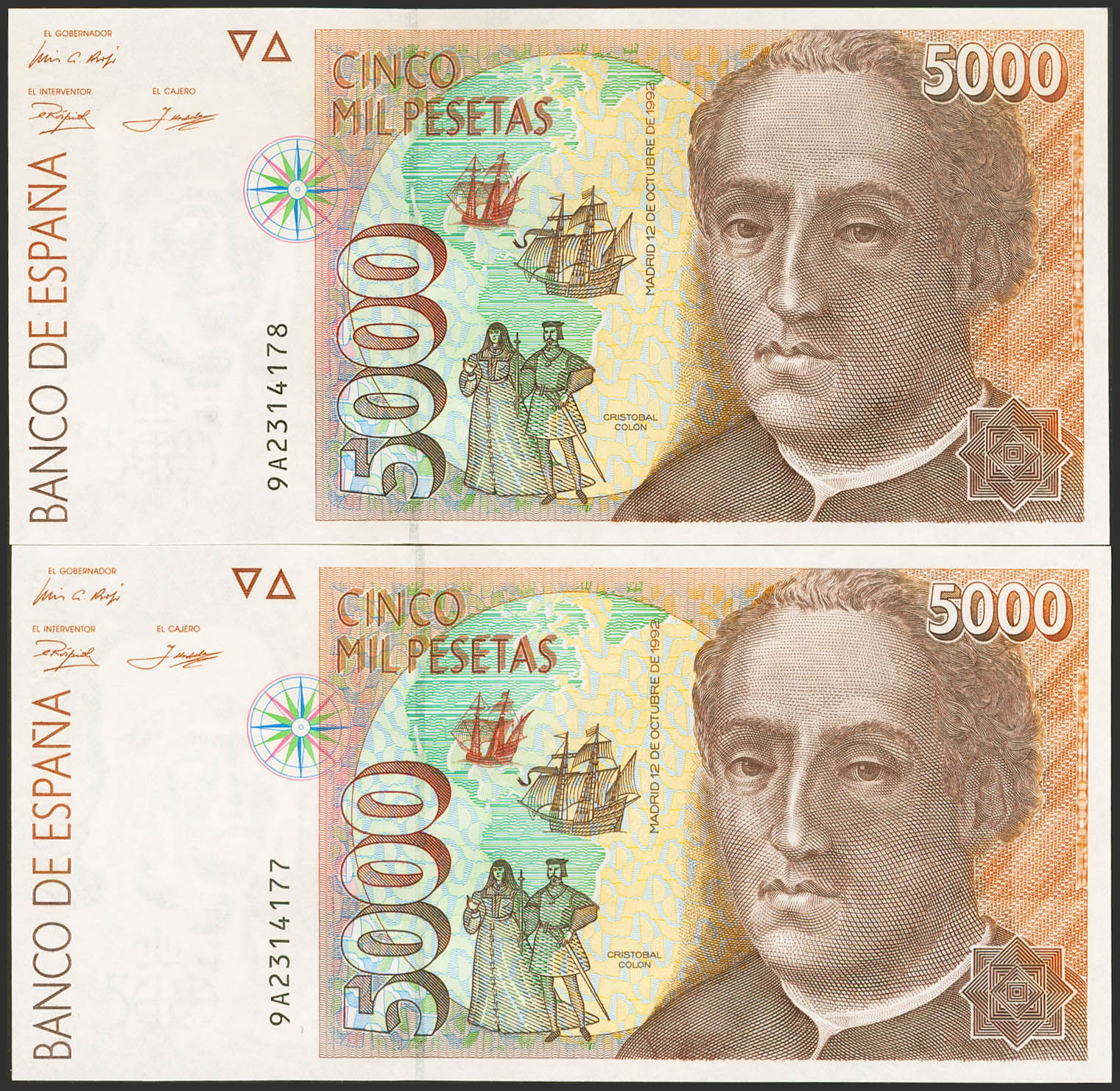 5000 Pesetas. 12 de Octubre de 1992. Pareja correlativa. Serie especial 9A. (Edifil 2023: 484b). SC.