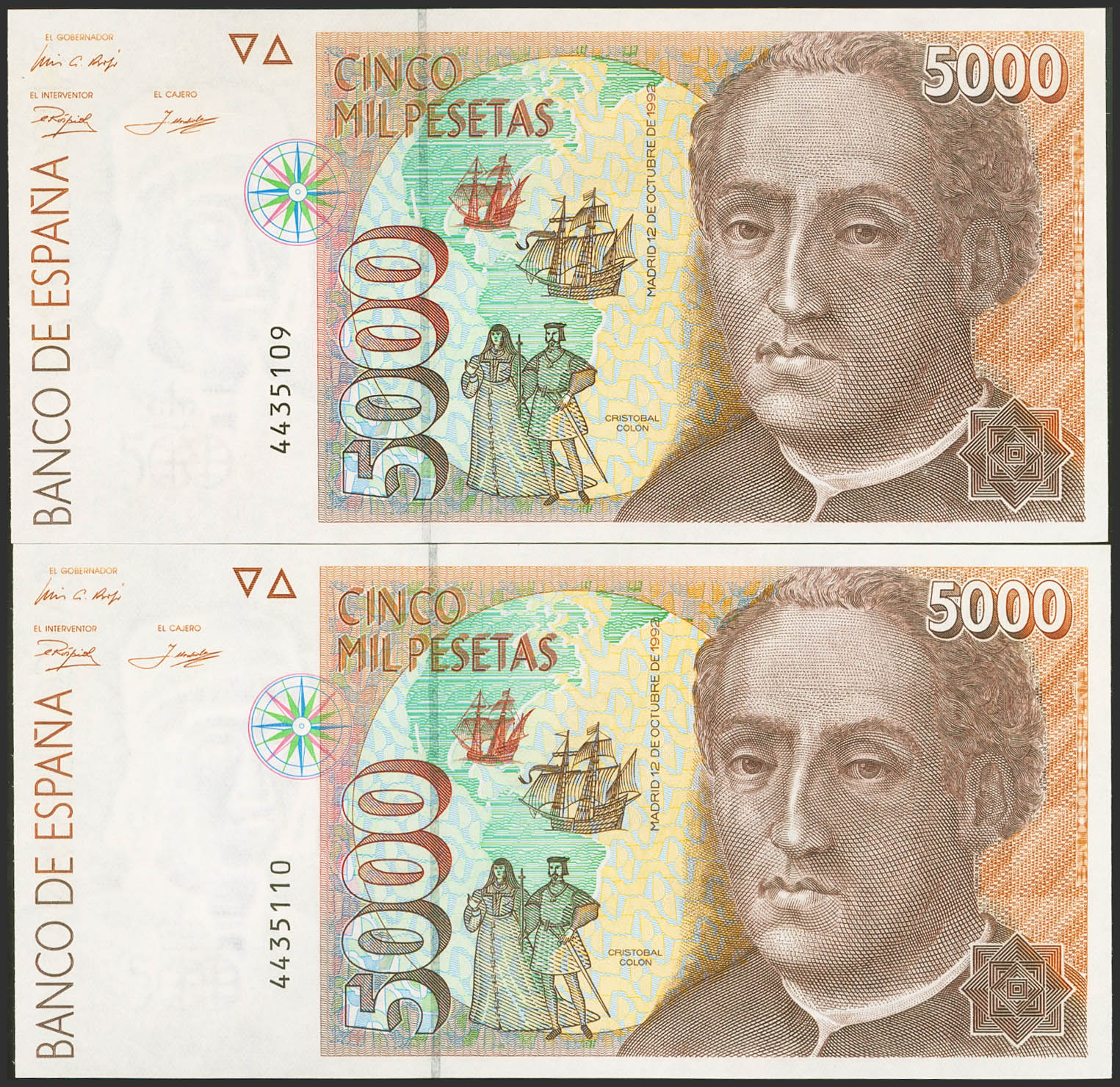 5000 Pesetas. 12 de Octubre de 1992. Pareja correlativa. Sin serie. (Edifil 2021: 484). SC.