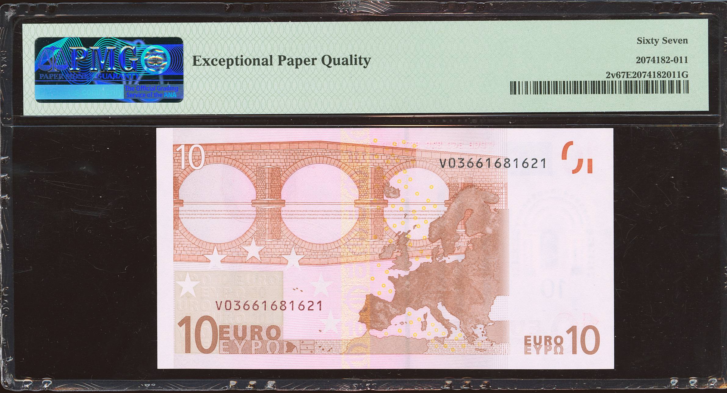 10 Euros. 1 de Enero de 2002. Firma Duisenberg. Serie V (España). (Edifil 2023: 487, Pick: 2v). SC. Encapsulado PMG67EPQ.