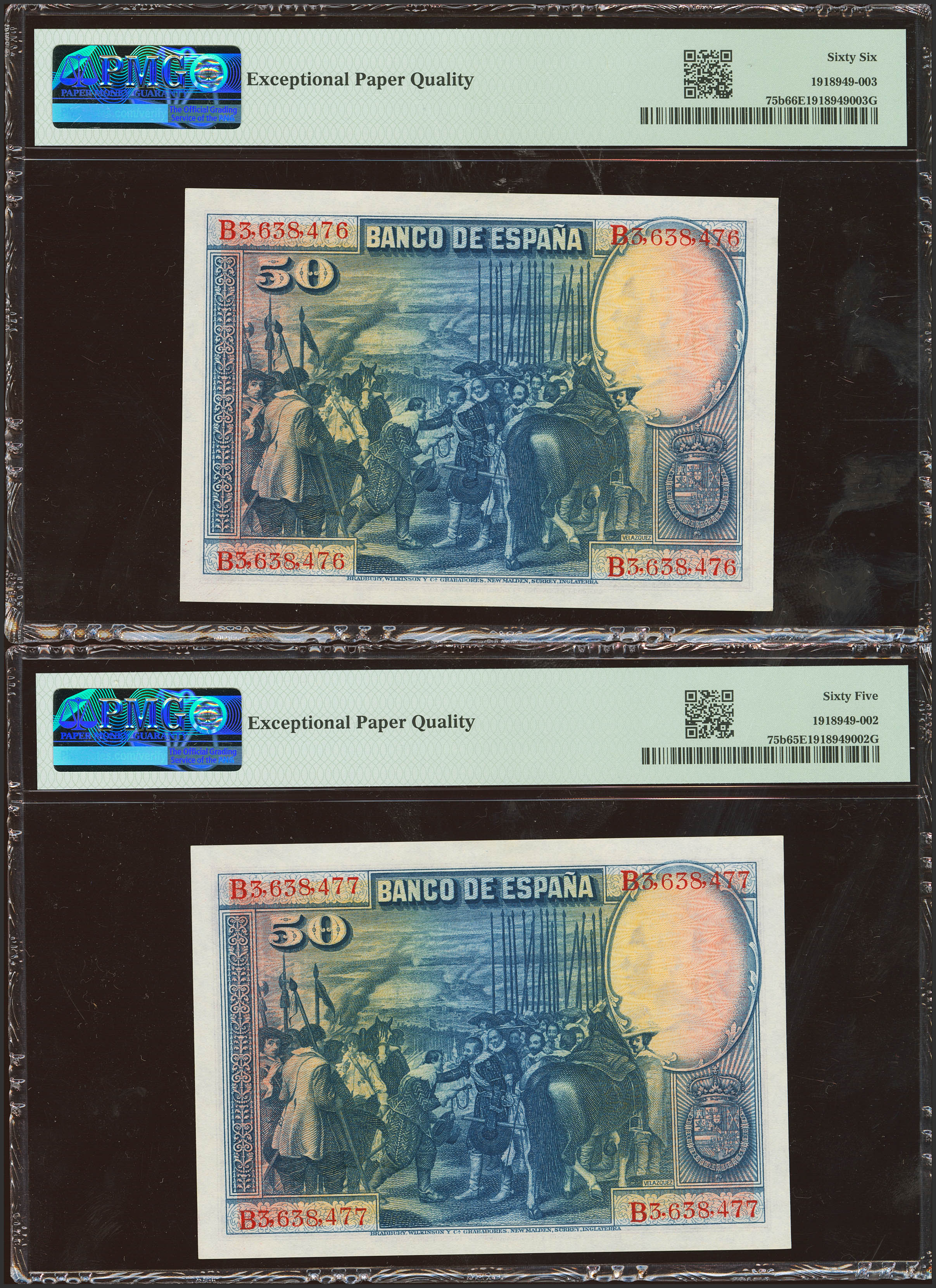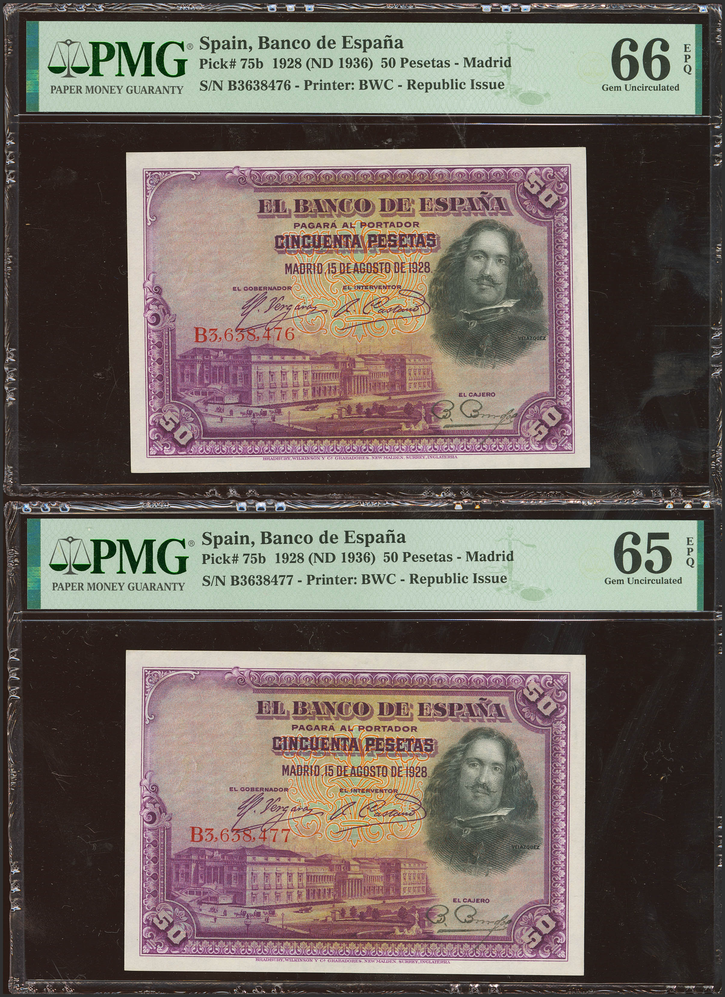 50 Pesetas. 15 de Agosto de 1928. Pareja correlativa. Serie B. (Edifil 2023: 354, Pick: 75b). Apresto original. SC. Encapsulados PMG66EPQ/65EPQ.