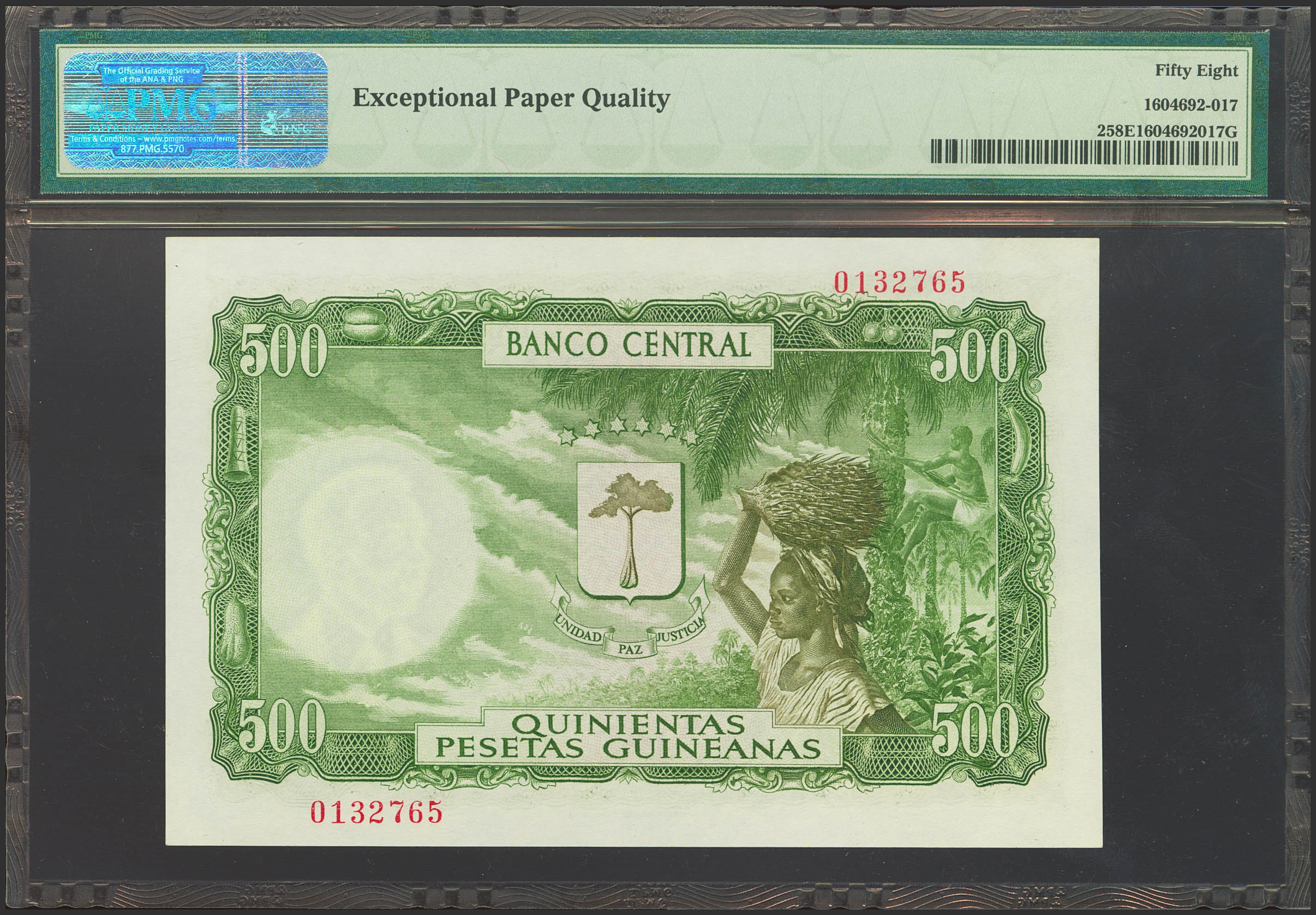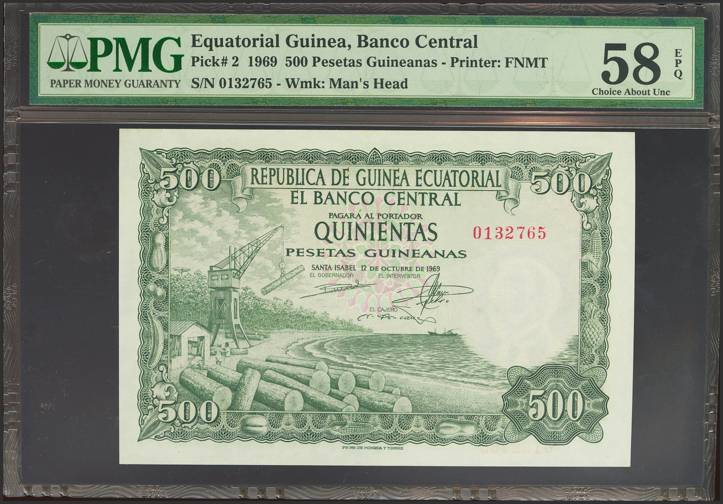 GUINEA ECUATORIAL. 500 Pesetas. 12 de Octubre de 1969. Sin serie. (Pick: 2). Apresto original. EBC+++. Encapsulado PMG58EPQ.