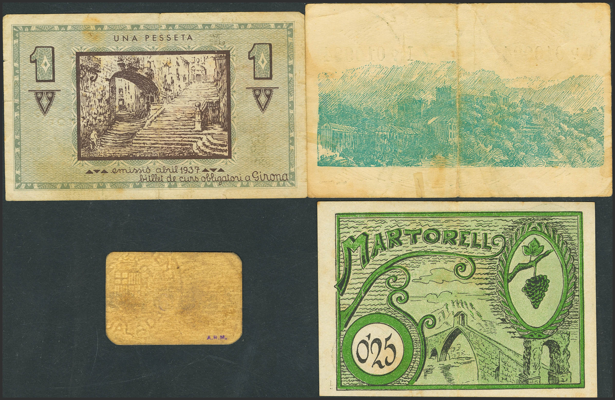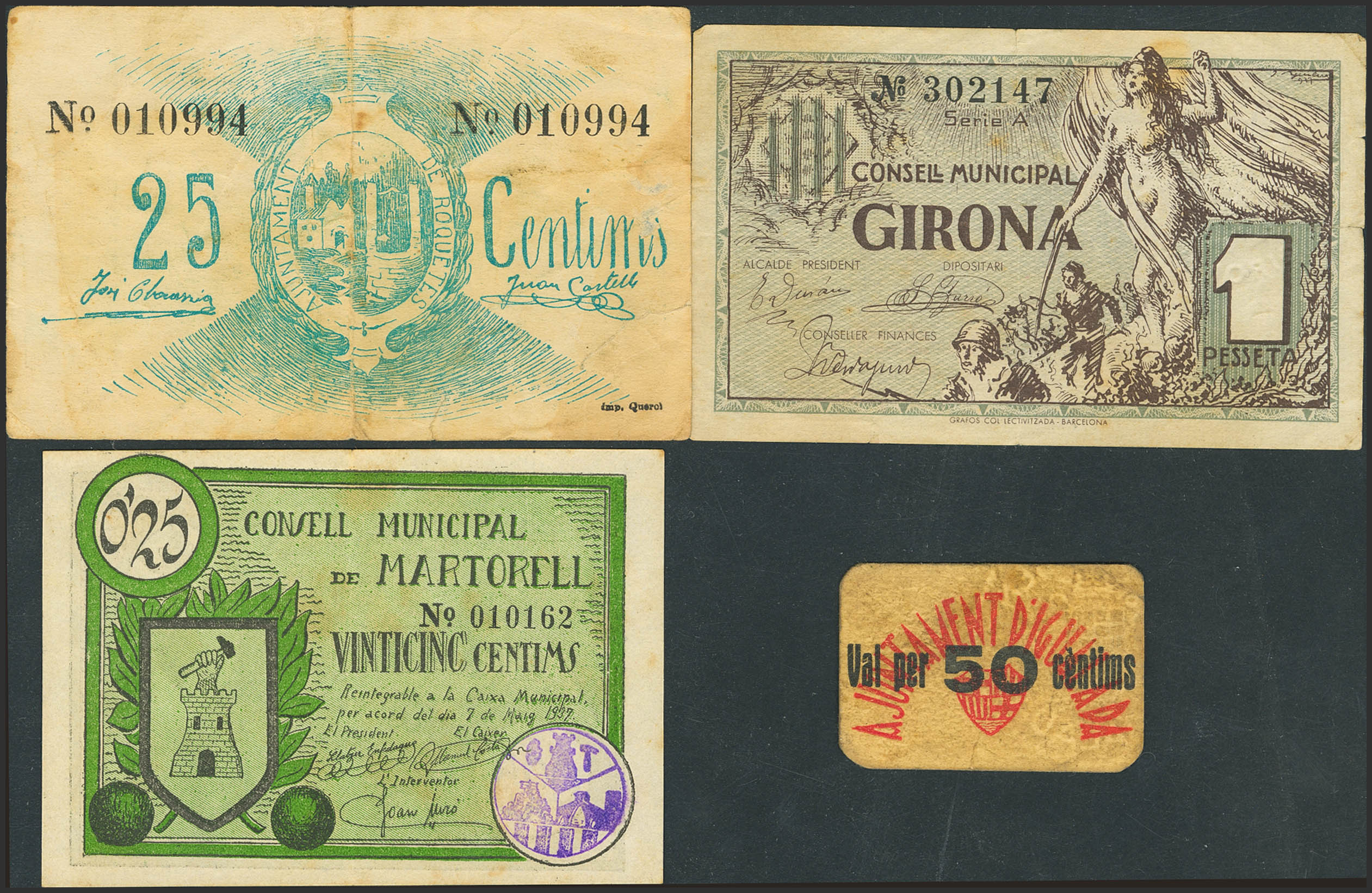 Conjunto de 4 billetes de la Guerra Civil, de diferntes localidades y en diversas calidades. A EXAMINAR.