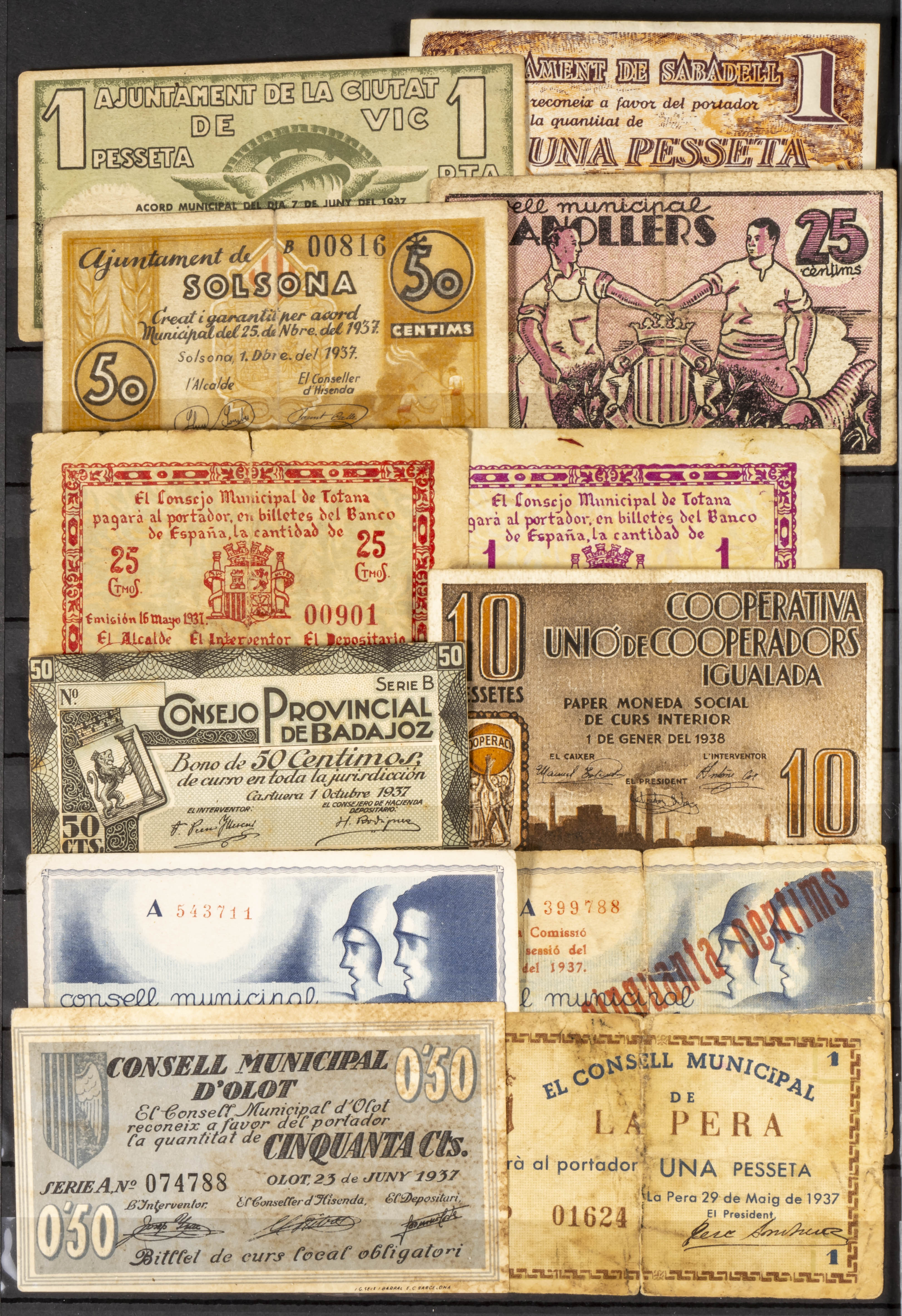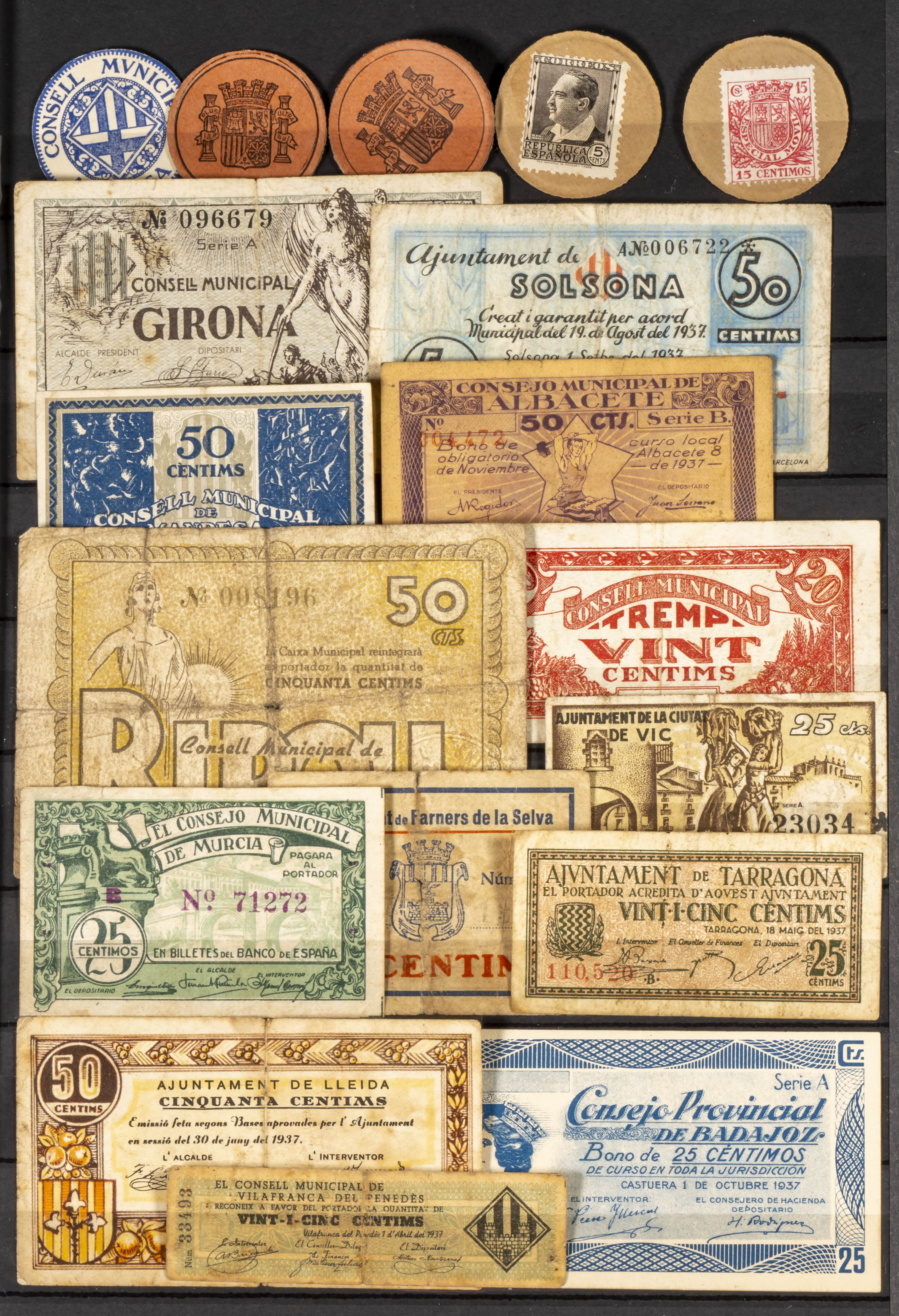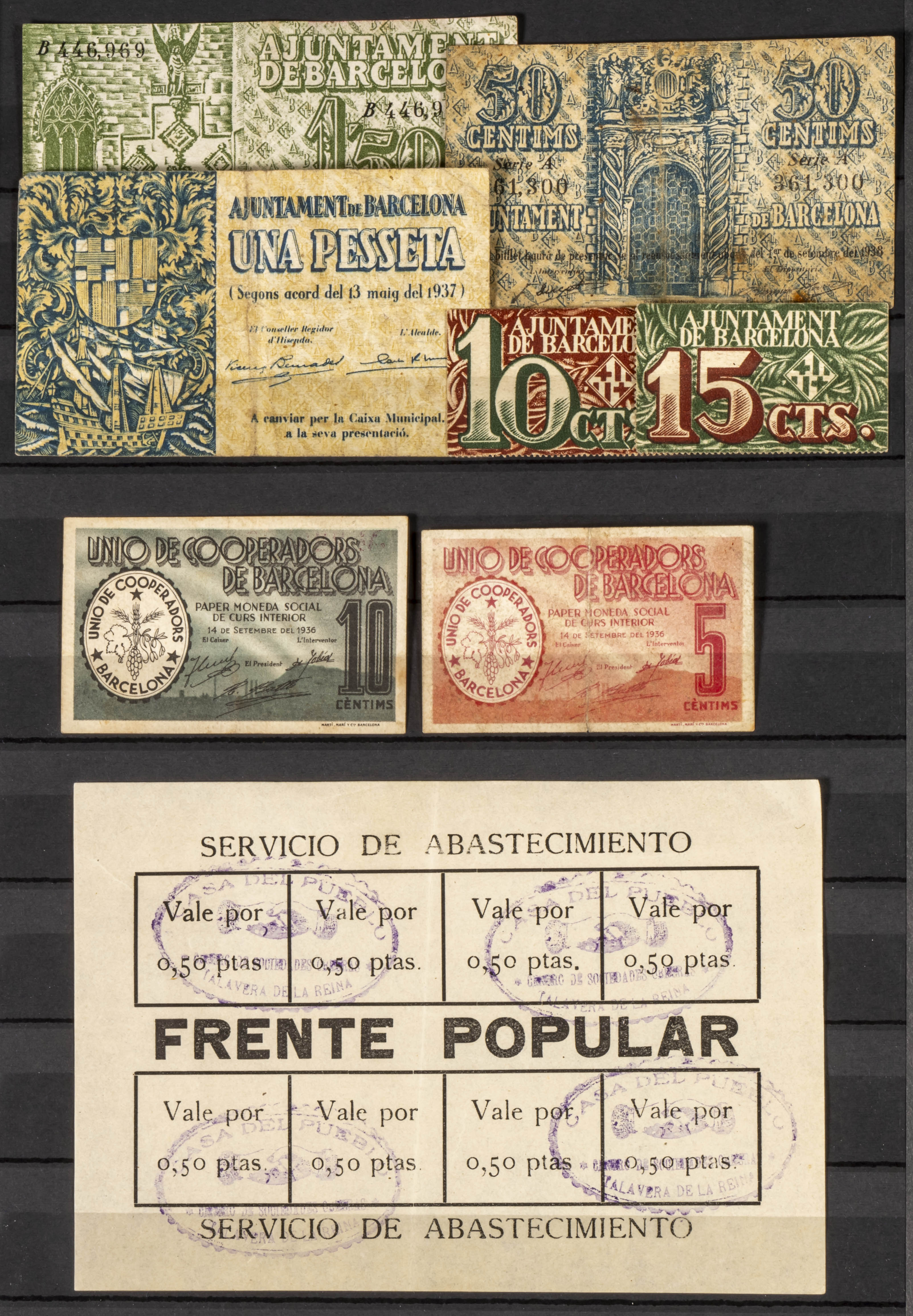 Conjunto de más de 30 billetes de la Guerra Civil, de diferentes localidades (la mayoría de ellos catalanes) y en diversas calidades. A EXAMINAR.