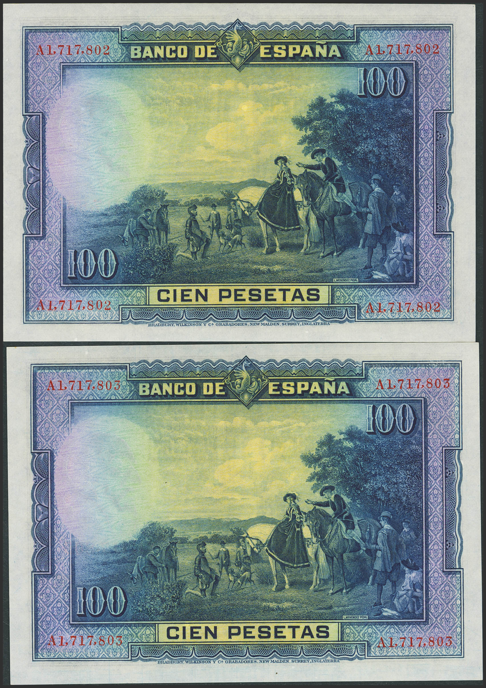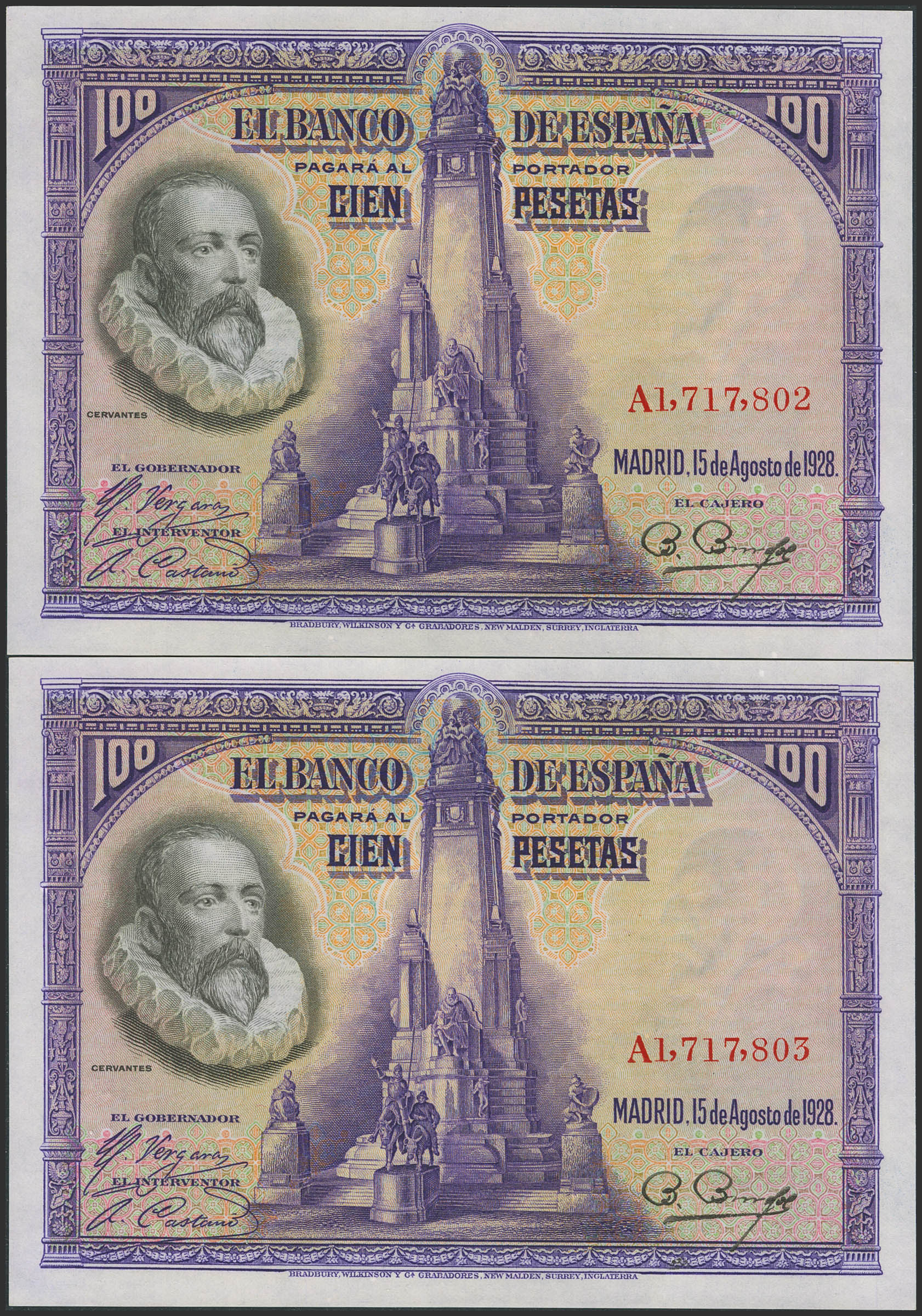 100 Pesetas. 15 de Agosto de 1928. Pareja correlativa. Serie A. (Edifil 2023: 355a). Conserva todo su apresto original. SC.