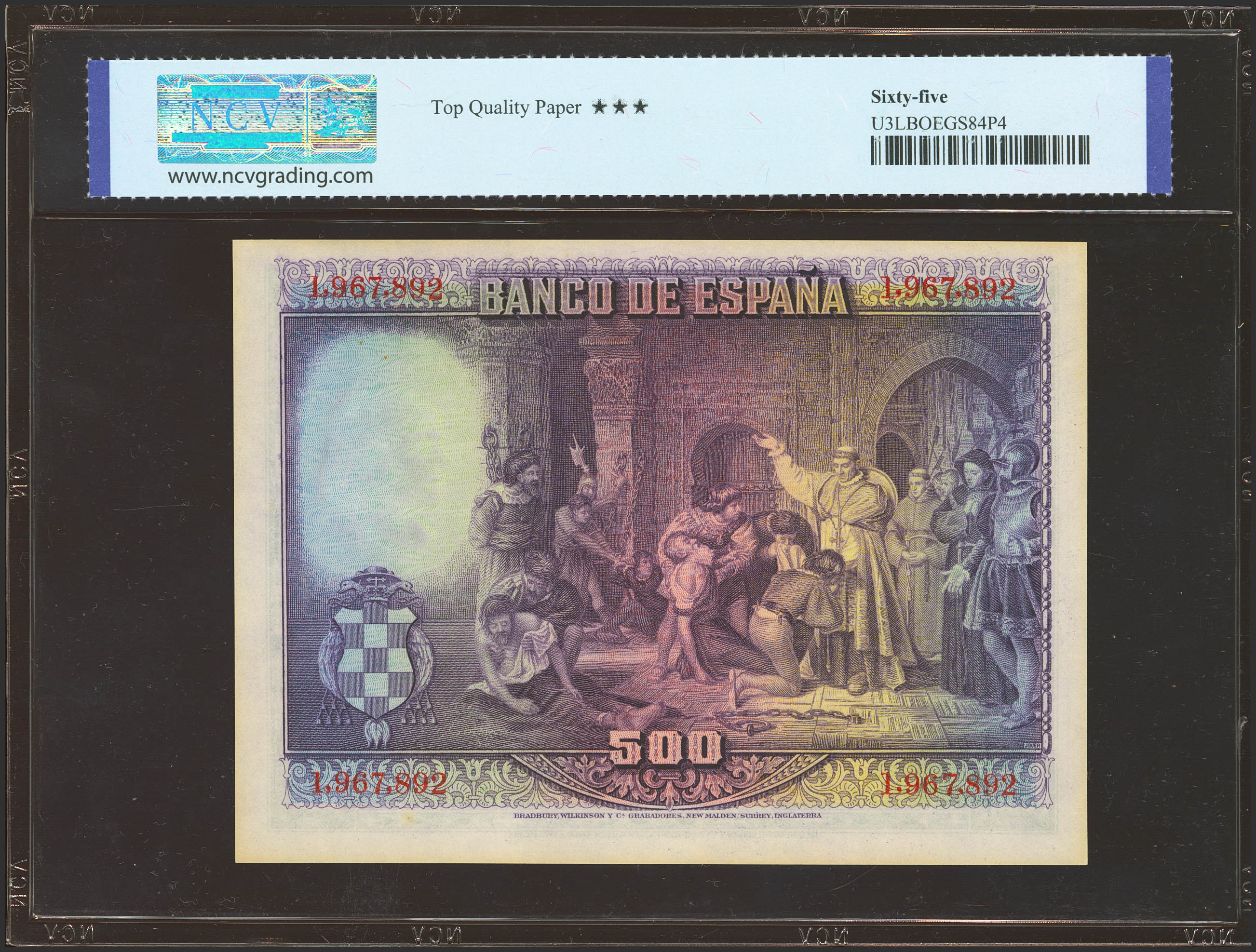500 Pesetas. 15 de Agosto de 1928. Sin serie. (Edifil 2021: 356, Pick: 77a). Apresto original, tonalizado. SC. Encapsulado NCV65TQP.