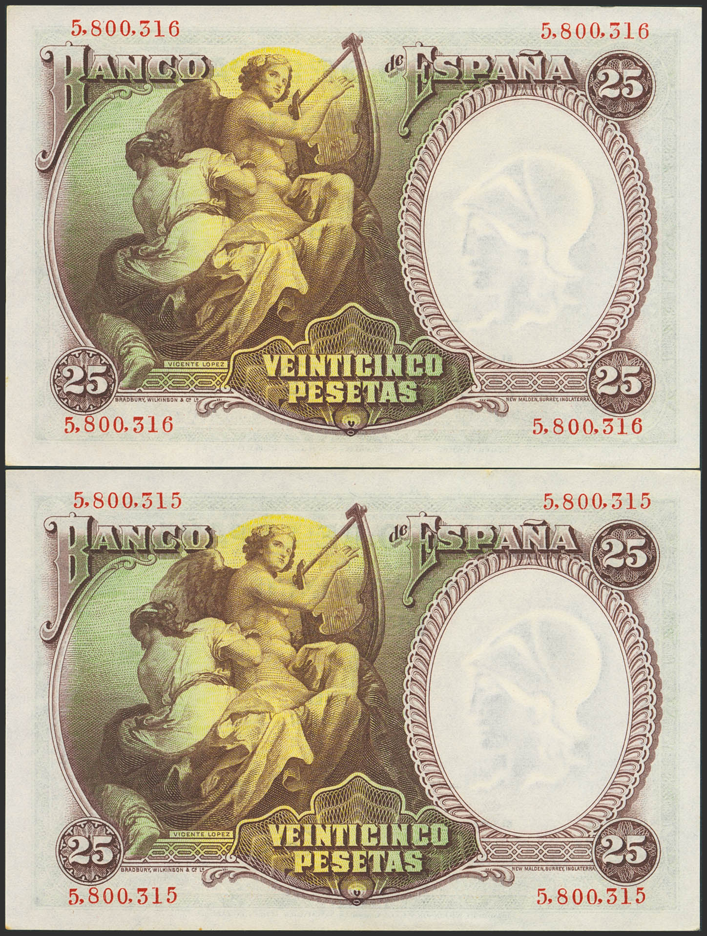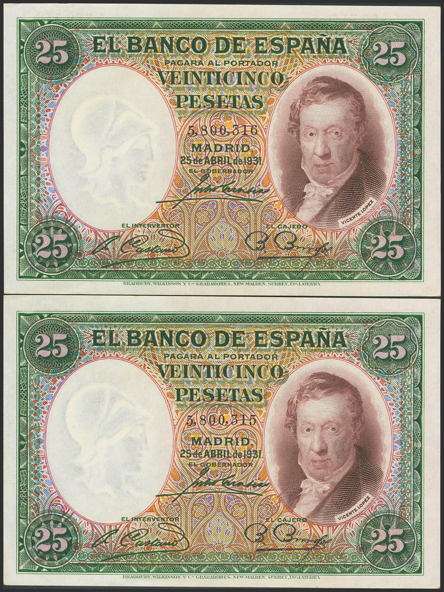 25 Pesetas. 25 de Abril de 1931. Pareja correlativa. Sin serie. (Edifil 2023: 358). Conserva todo el apresto original. SC-.