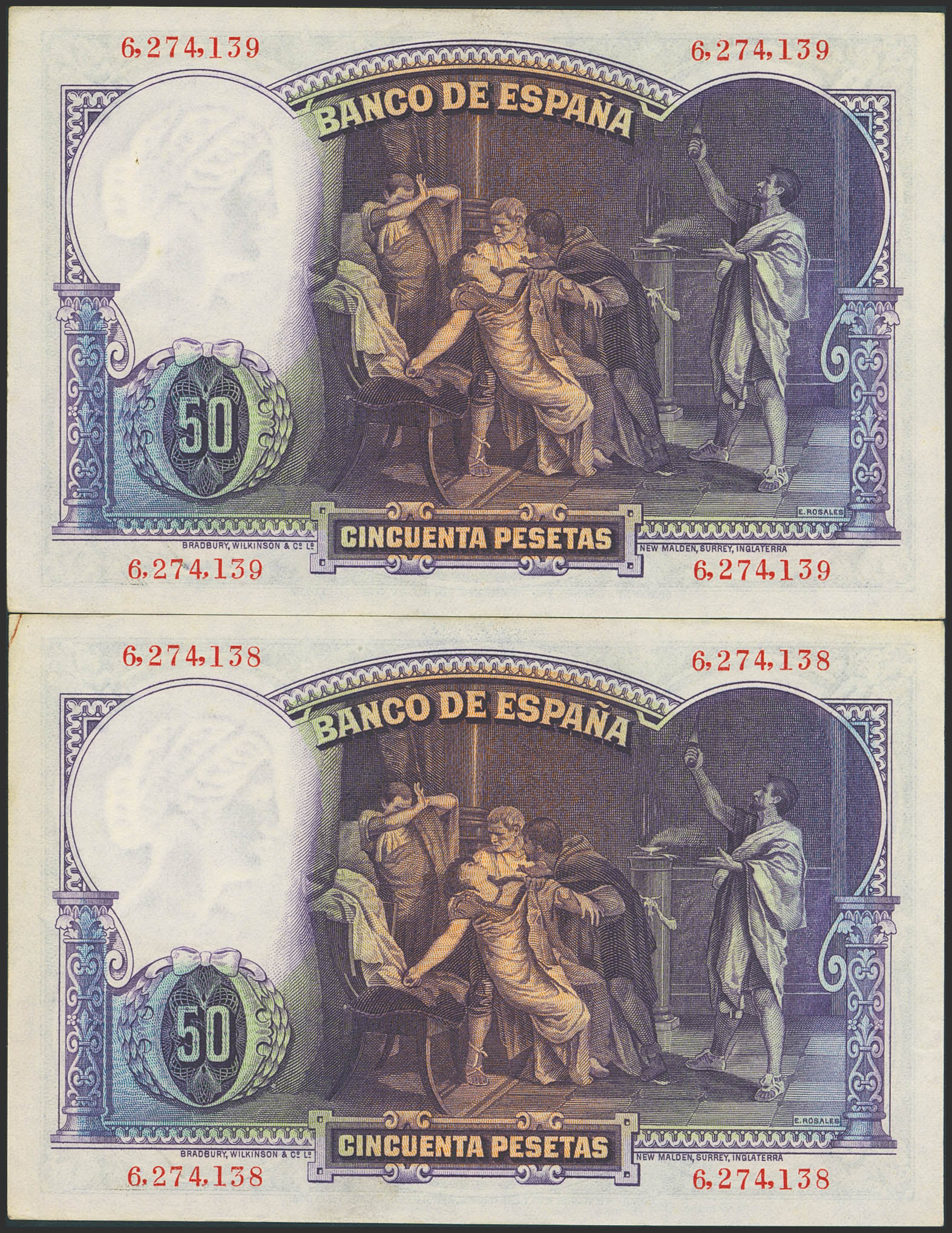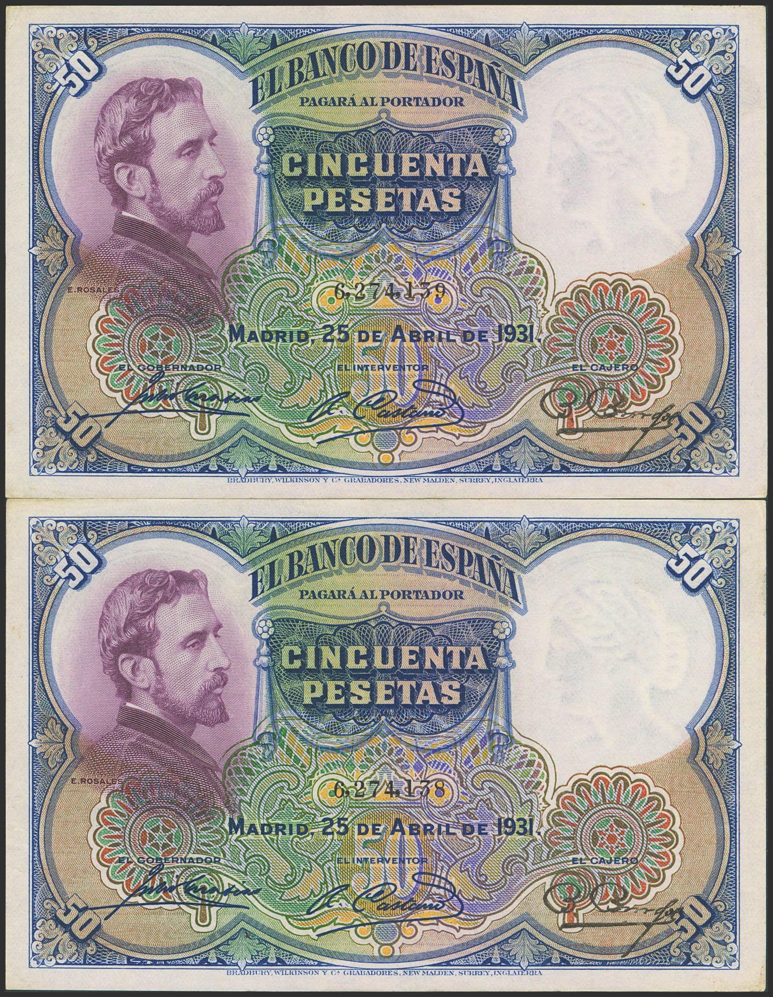 50 Pesetas. 25 de Abril de 1931. Pareja correlativa. Sin serie. (Edifil 2023: 359). Apresto original, rara en esta conservación. SC--.