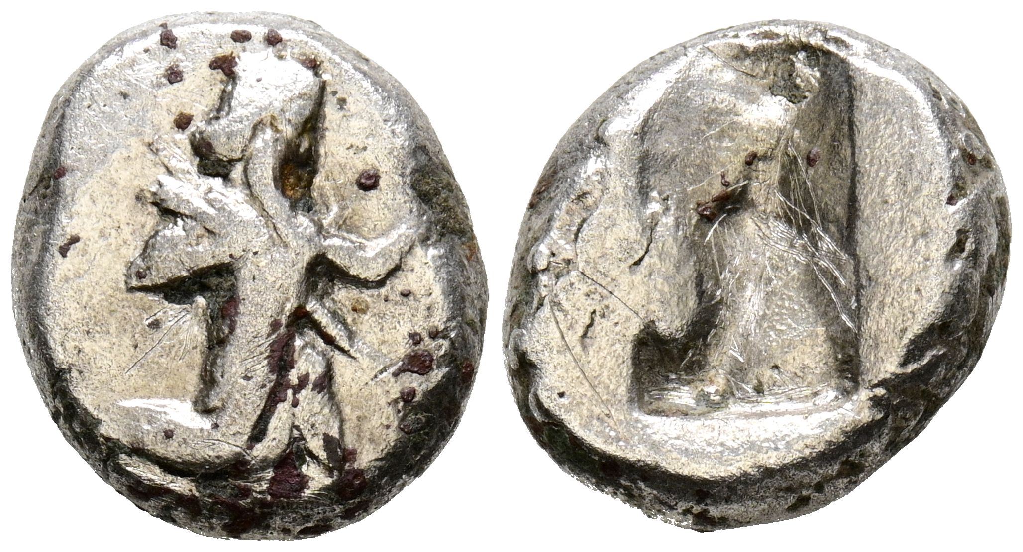IMPERIO AQUEMENIDA, Tiempo de Xerxes I a Daríos II. Siglos. (Ar. 4,35g/15mm). 485-420 a.C. Sardes. (Sunrise 25). Anv: Rey persa arrodillado a derecha portando arco y lanza y carcaj en su espalda. Rev: Cuadrado incuso. MBC. Limpiada y depositos.