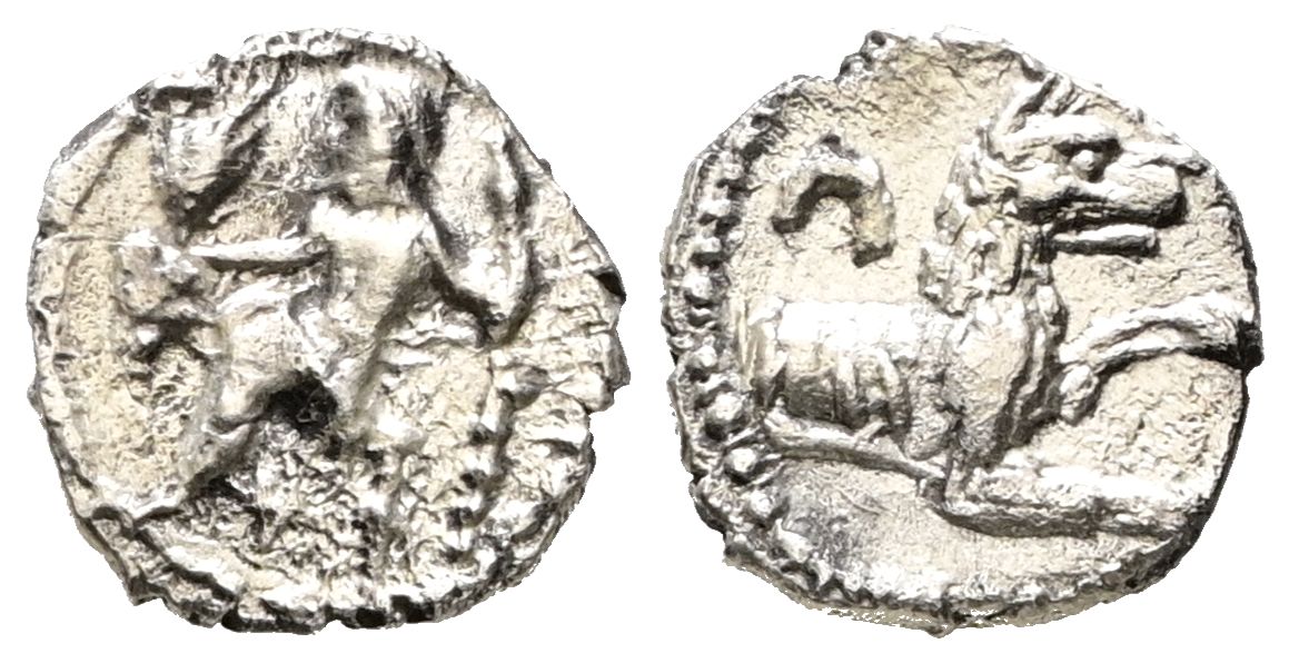 LYKAONIA, Laranda. Obolo. (Ar. 0,71g/11mm). 324-323 a.C. (SNG von Aulock 5422). Anv: Baaltars sentado a izquierda portando espiga y racimo de uvas y cetro. Rev: Parte delantera de lobo a derecha, encima creciente hacia abajo. MBC+.