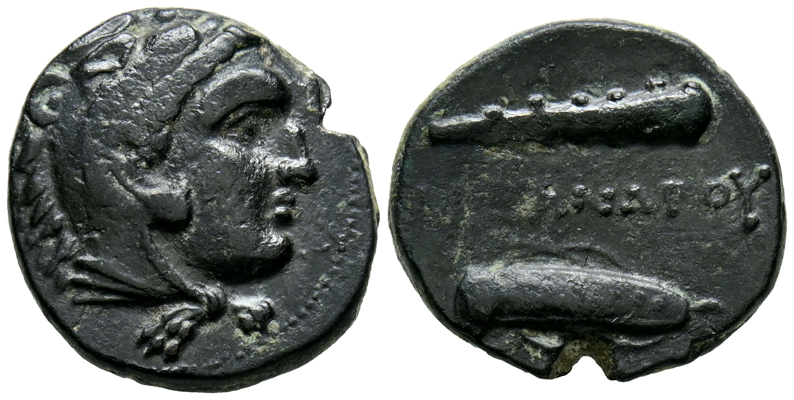 REYES DE MACEDONIA, Alejandro III el Grande. Ae18. (Ae. 5,00g/18mm). 336-323 a.C. Ceca incierta. (Price 266; HGC 3.1, 925a). Anv: Cabeza de Hércules con piel de león a derecha. Rev: Leyenda griega: AΛΕΞΑΝΔΡOY, entre mazo y arco con carcaj. MBC+.