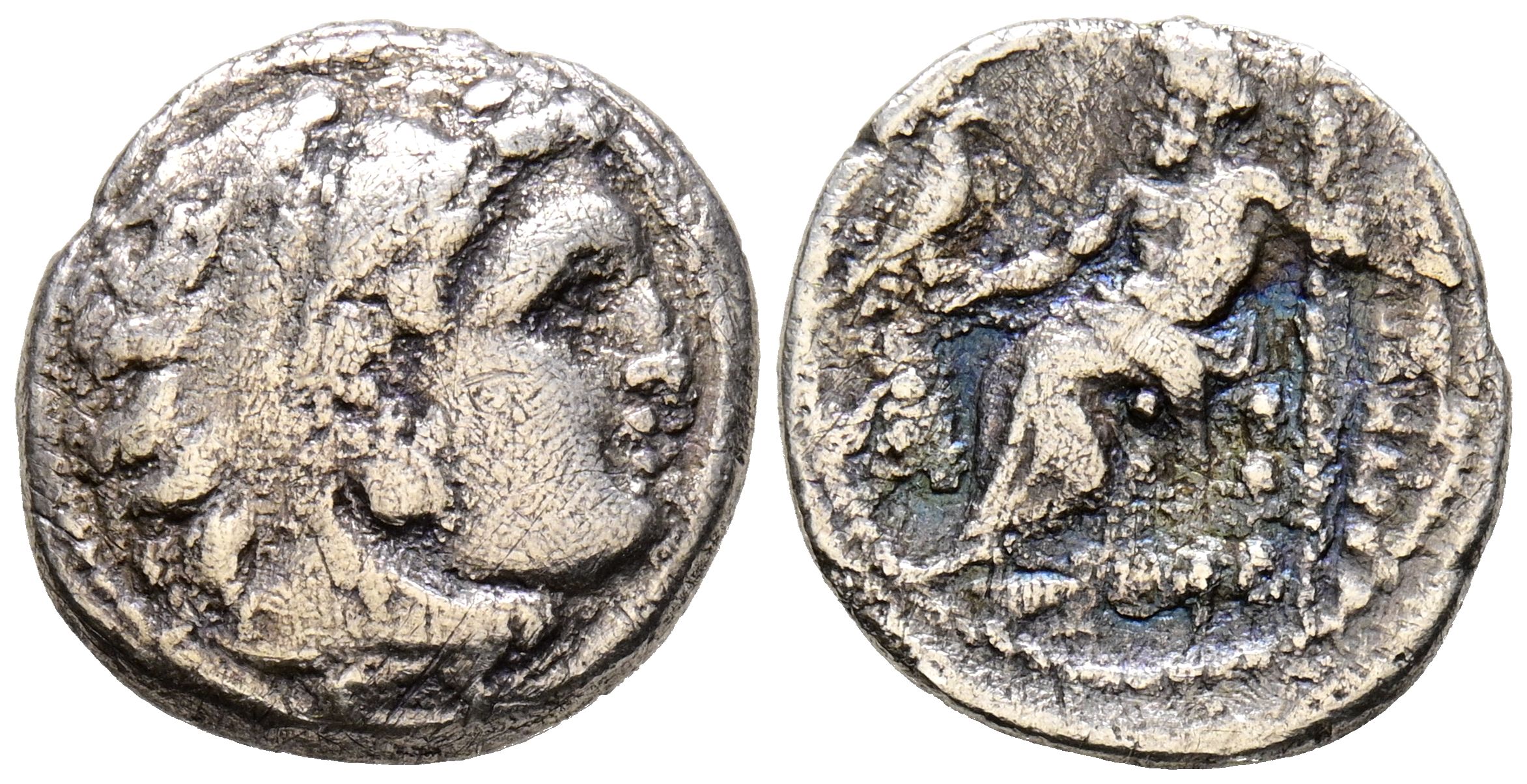 REYES DE MACEDONIA, Alejandro III el Grande. Dracma. (Ar. 3,29g/17mm). 336-323 a.C. Ceca a identificar. Anv: Cabeza de Heracles con piel de león a derecha. Rev: Zeus sentado a izquierda portando cetro y águila, delante símbolo a identificar, debajo del trono monograma, detrás leyenda griega: ΑΛΕΞΑΝΔΡΟΥ. MBC-.