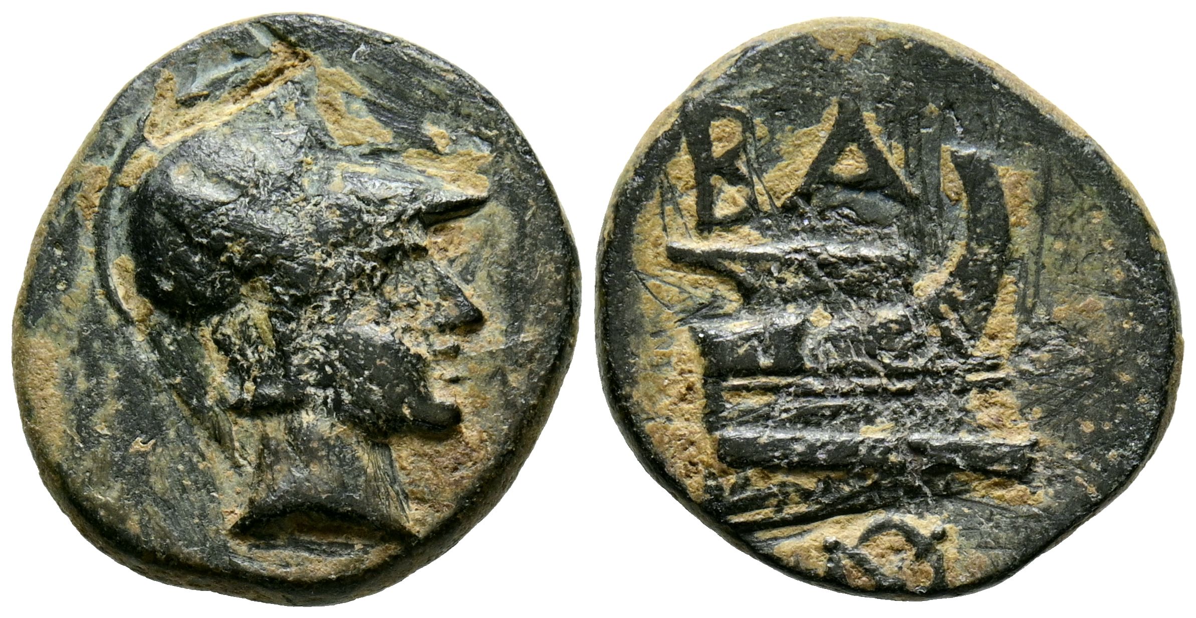 REYES DE MACEDONIA, Demetrios I Poliorketes. Ae17. (Ae3,38g/17mm). 300-295 a. C. Salamina. (SNG Copenhagen 1194). Anv: Cabeza de Atenea a la derecha, con casco corintio adornado con un cuerno de toro. Rev: Proa de galera a la derecha, encima BA, debajo monograma. MBC.