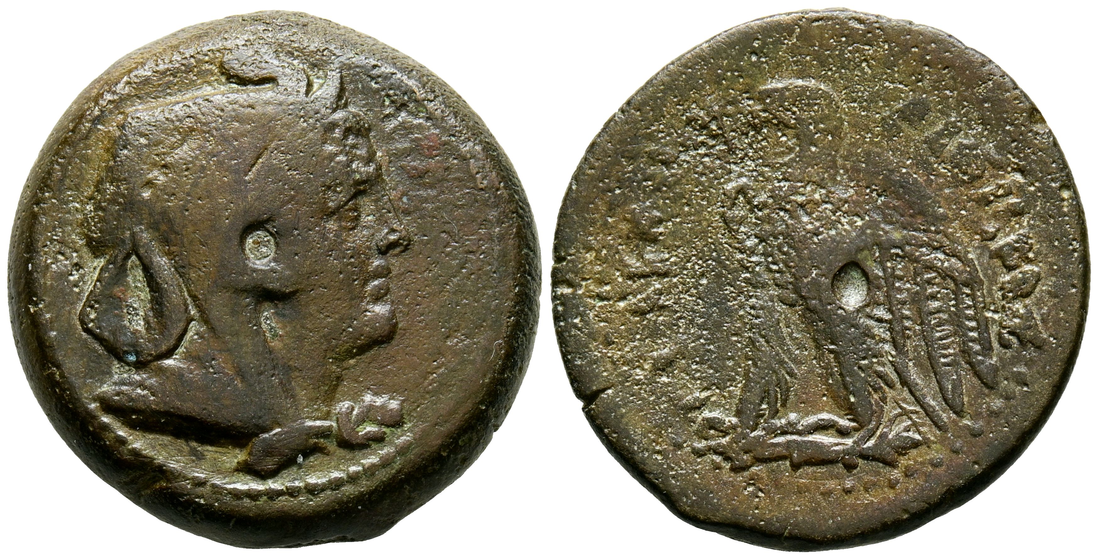 REINO PTOLEMÁICO. Ptolomeo V Epiphanes o Ptolomeo VI Philometor. Ae25. (Ae. 11,29g/24mm). 204-145 a.C. (Svoronos 1236; SNG Copenhagen 249-252). Anv: Cabeza de Alejandro III el Grande a derecha con piel de elefante. Rev: Águila estante a izquierda sobre rayo, alrededor leyenda griega. MBC-. Escasa.