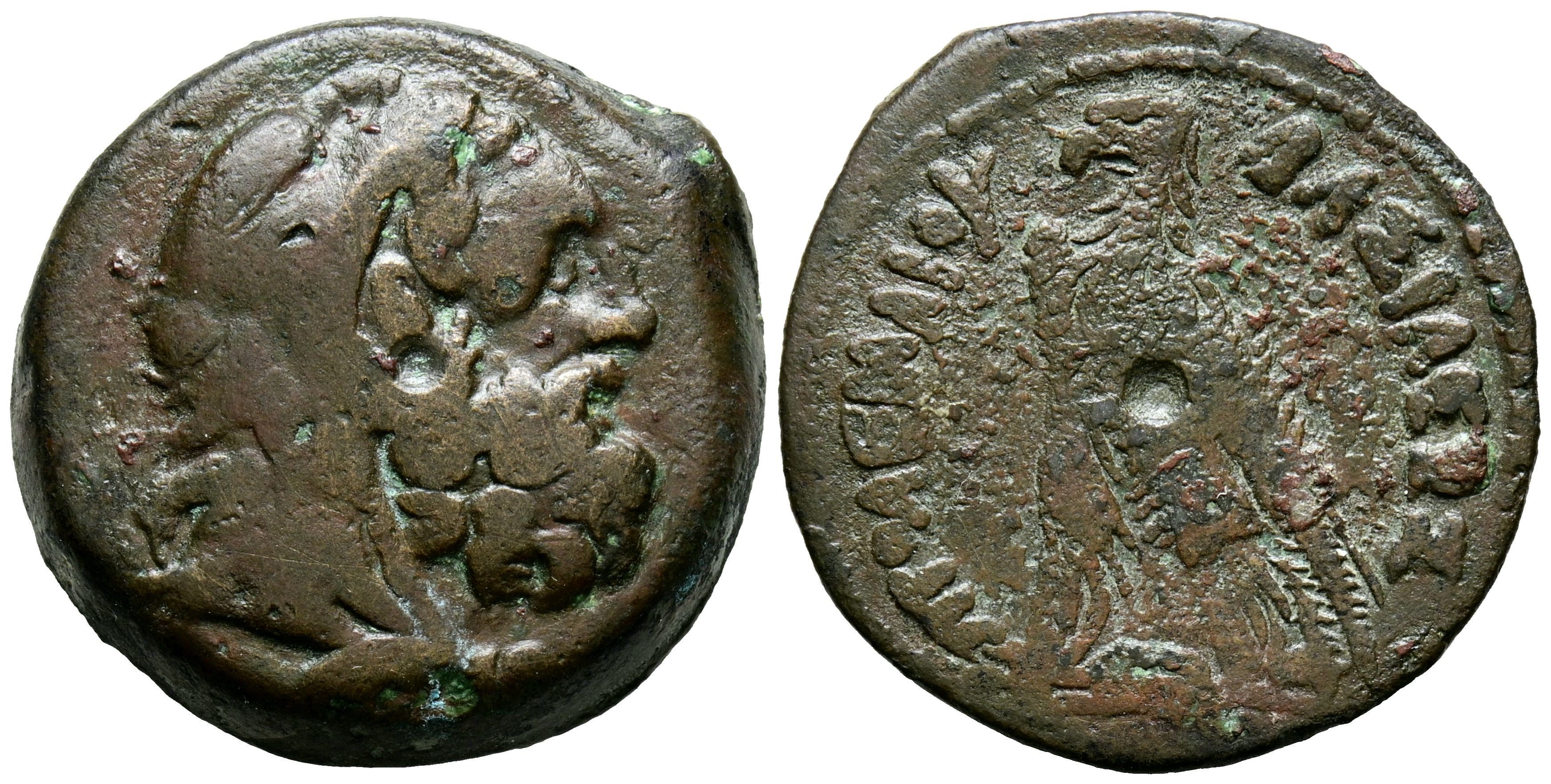 REINO PTOLEMAICO, Ptolomeo V. Ae25 (Ae. 12,56g/25mm). 204-180 a.C. Alejandría. (Svoronos 1494; SNG Copenhagen 339-43). Anv: Cabeza barbada de Heracles a la derecha, con tocado de piel de león. Rev: Águila con las alas cerradas de pie a la izquierda sobre rayo. MBC-.