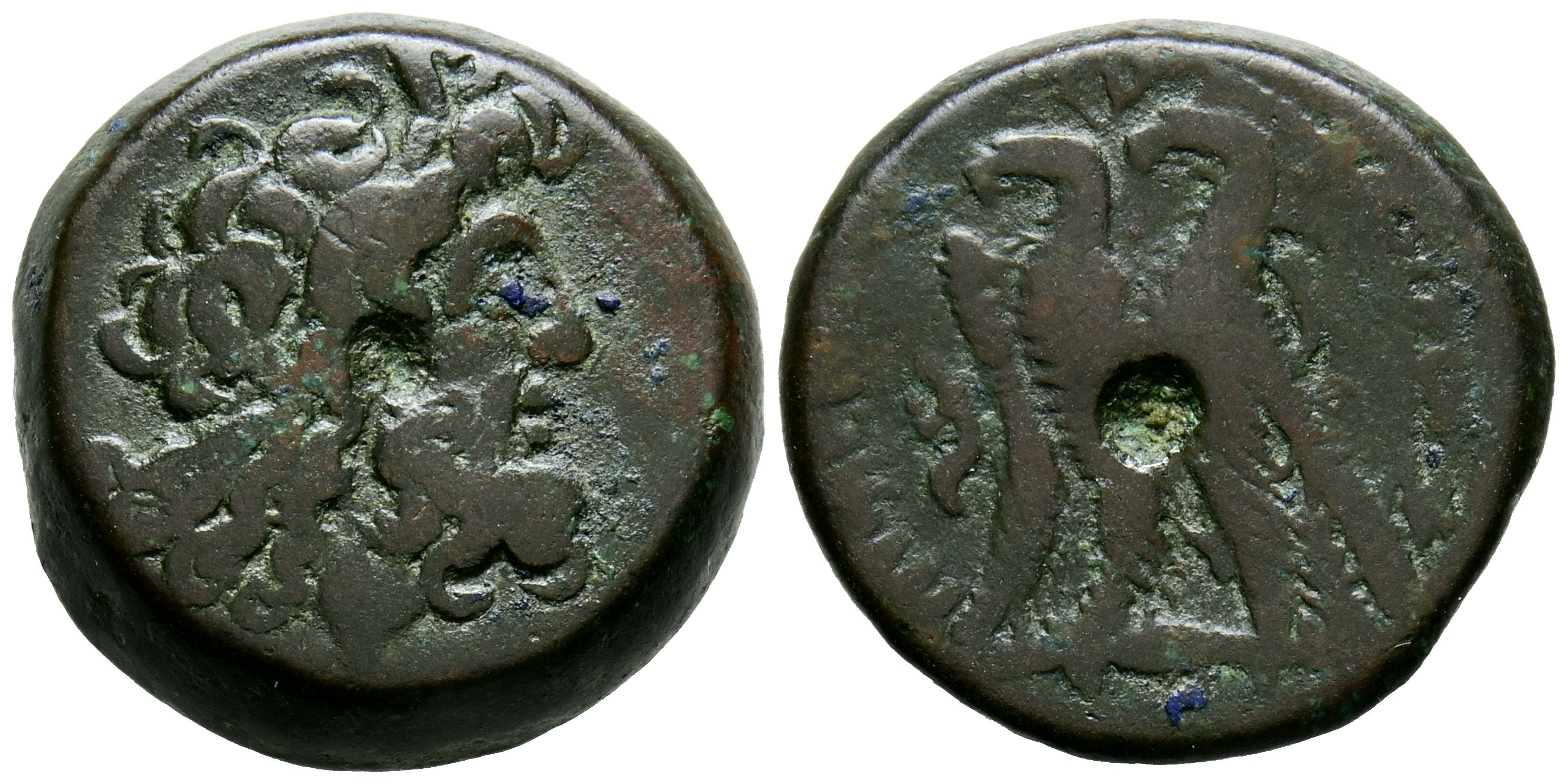 REINO PTOLEMAICO, Ptolomeo VI y Ptolomeo VIII. Ae19. (Ae. 9,08g/19mm). 170-164 a.C. Alejandría. (Svoronos 1426). Anv: Cabeza de Zeus-Ammon diademada a la derecha. Rev: Dos águilas de pie a la izquierda sobre rayo y cornucopia a la izquierda, alrededor leyenda griega. MBC.