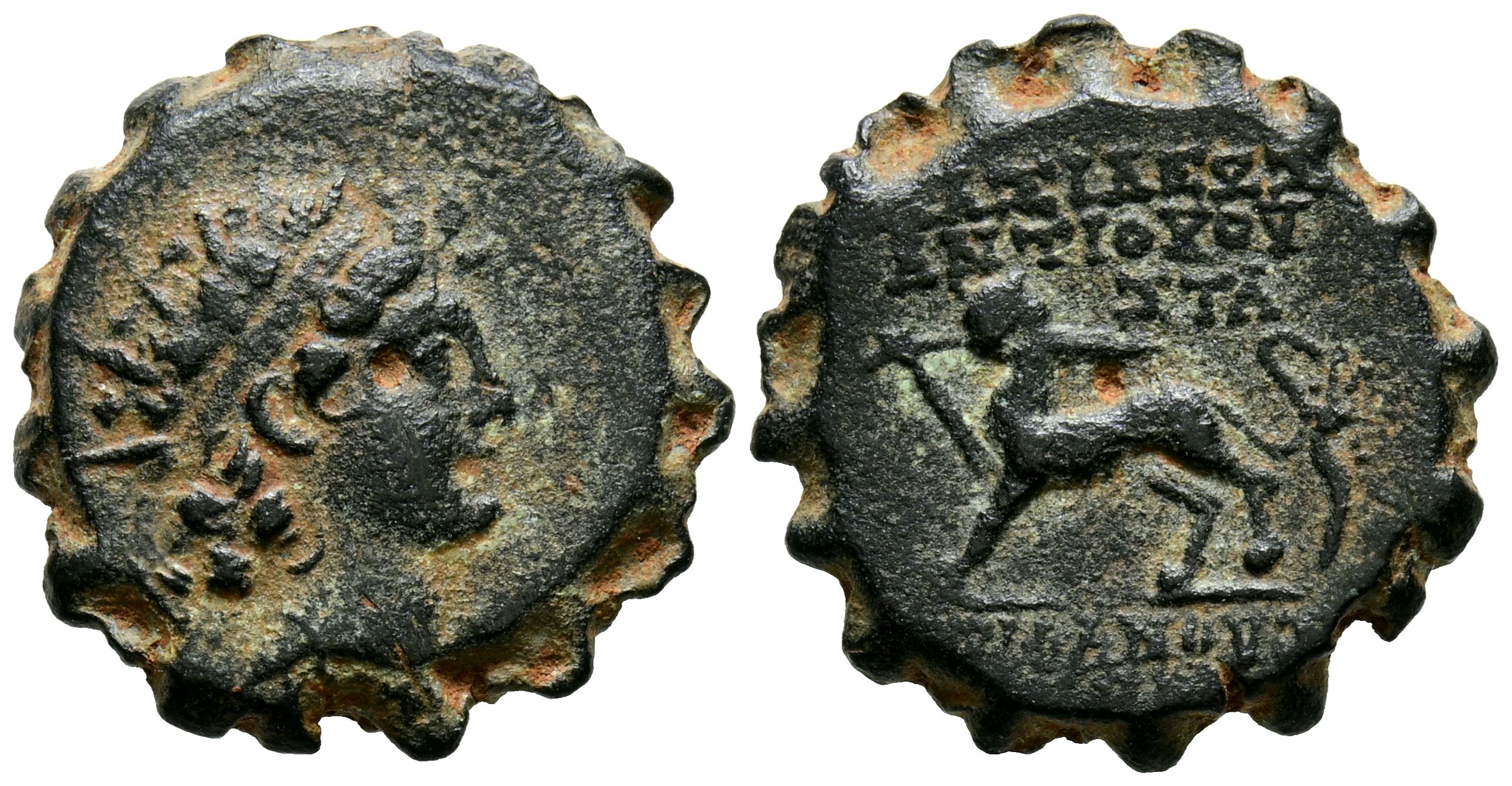 REYES SELEUCIDAS, Antíoco VI Dionisos. (Ae. 4,27g/18mm) 144-142 a. C. Antioquía en el Orontes. (Seaby 2007c). Anv: Cabeza radiada y diademada de Antíoco VI a la derecha. Rev: Pantera avanzando a izquierda, con la pata delantera levantada y sosteniendo lanza rota en la boca, arriba ΣTA, alrededor leyenda: BAΣIΛEΩΣ ANTIOXOY EΠIΦANOYΣ ΔIONYΣOY. MBC.