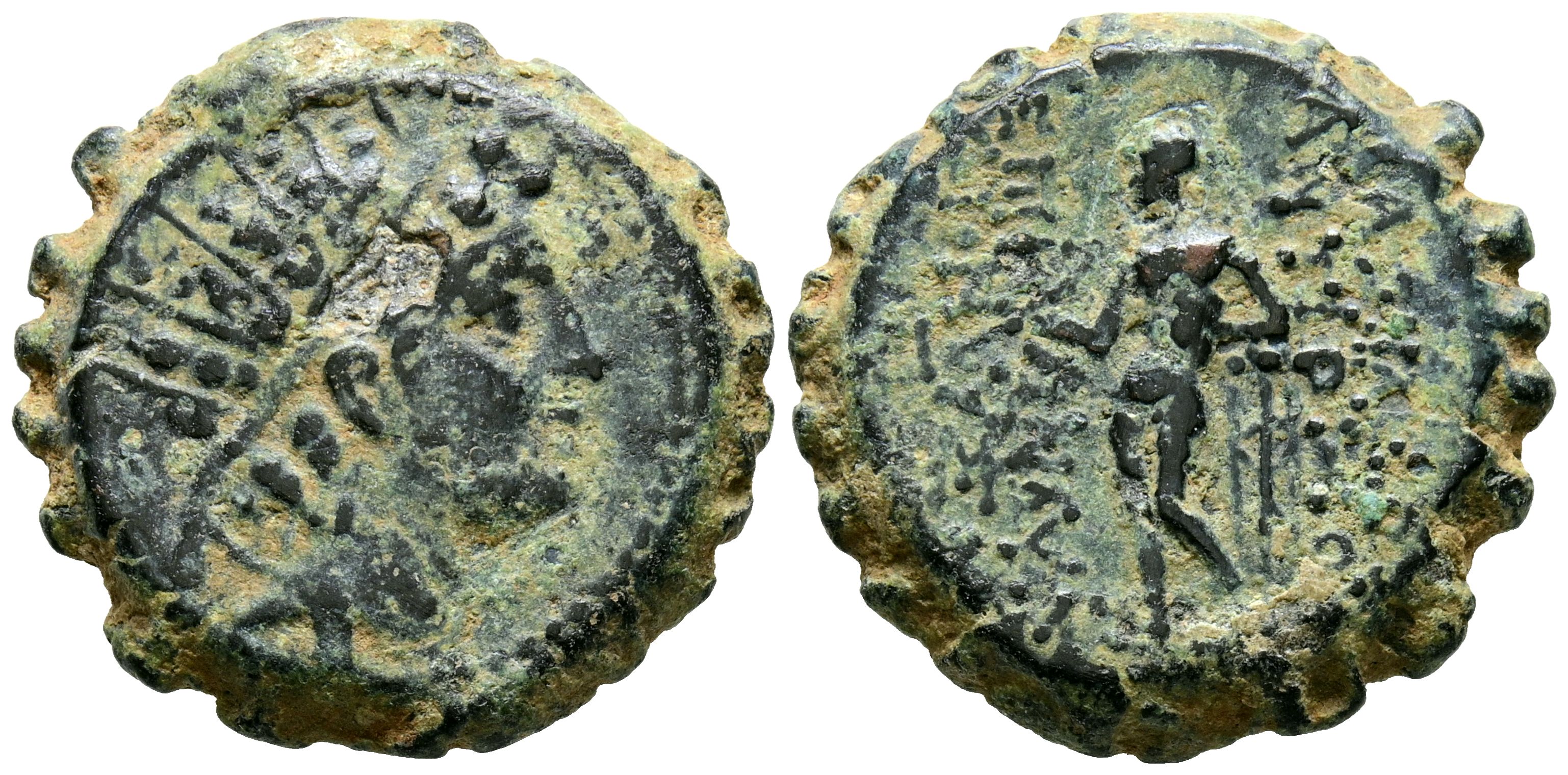 REINO SELEUCIDA, Antiochos VI Dionysos. Ae21 (Ae. 9,34g/21mm). 144-142 a. C. Ake-Ptolemais. (Seaby 2023). Anv: Busto radiado de Antiocos VI a derecha. Rev: Apolo estante a izquierda portando cetro y apoyado sobre tripode, alrededor leyenda griega: BAΣIΛEΩΣ/ANTIOXOY- EΠIΦANOYΣ/ΔIONYΣOY. MBC.