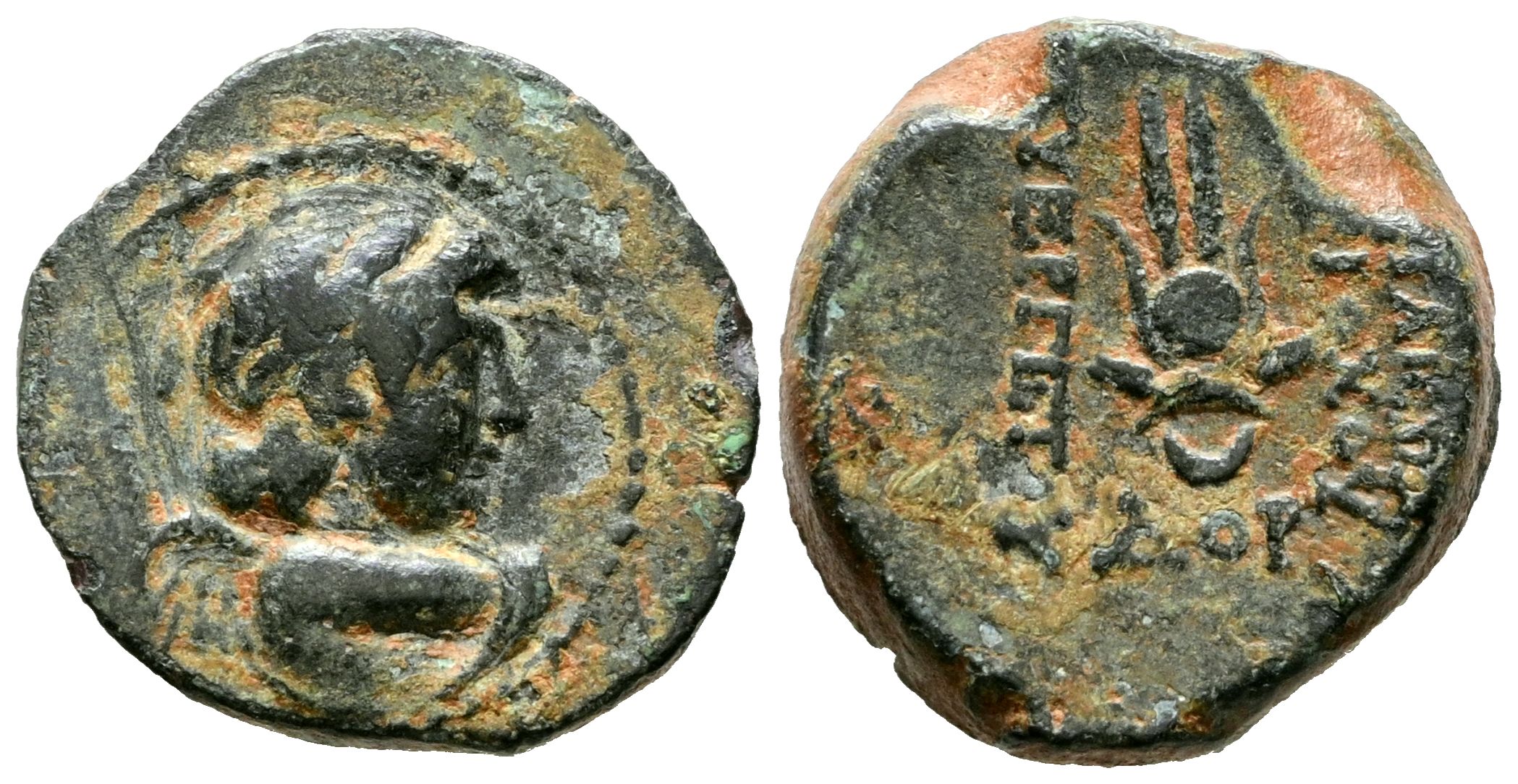 REINO SELEUCIDA, Antíoco VII Euergetes. Ae19. (Ae. 5,81G/19mm). 138-129 a. C. Antioquía. (HGC 9, 1087; Seaby 2067). Anv: Busto alado de Eros a la derecha. Rev: Tocado de Isis, debajo: EOP, a los lados leyenda: ΒΑΣΙΛΕΩΣ ΑΝΤΙΟΧΟΥ / ΕΥΕΡΓΕΤΟΥ. MBC.