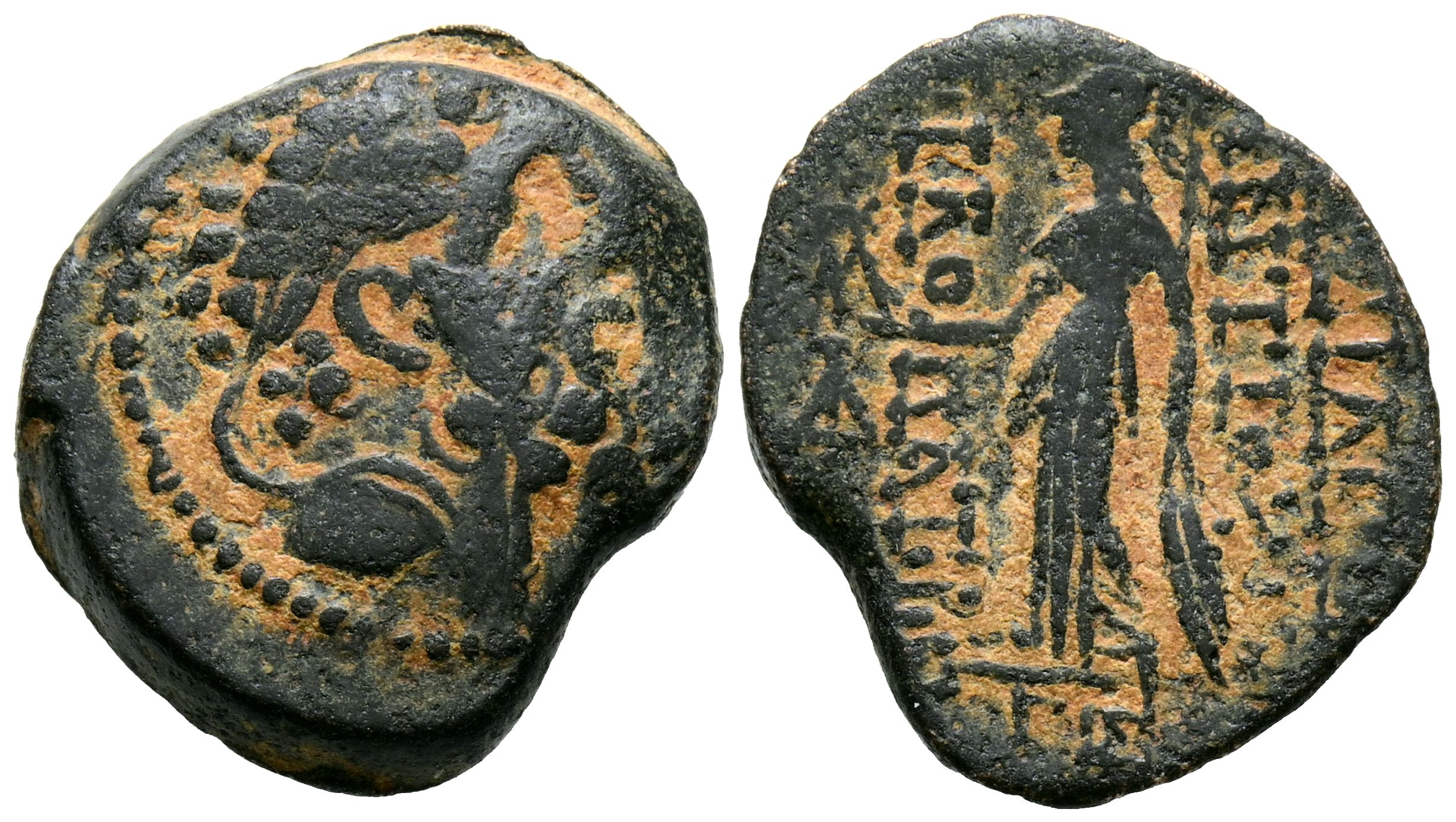 REINO SELEUCIDA, AntíocHo IX Eusebes Fhilopator. Ae19. (Ae. 4,89g/19mm). 114-95 a. C. Antioquía en el Orontes. (HGC 9, 1250). Anv: Cabeza laureada de Heracles a la derecha. Rev: Atenea estante a la izquierda, sosteniendo a Niké y apoyando la mano sobre el escudo, alrededor leyenda griega: ΒΑΣΙΛΕΩΣ ΑΝΤΙΟΧΟΥ / ΦIΛOΠATOPOΣ. MBC.