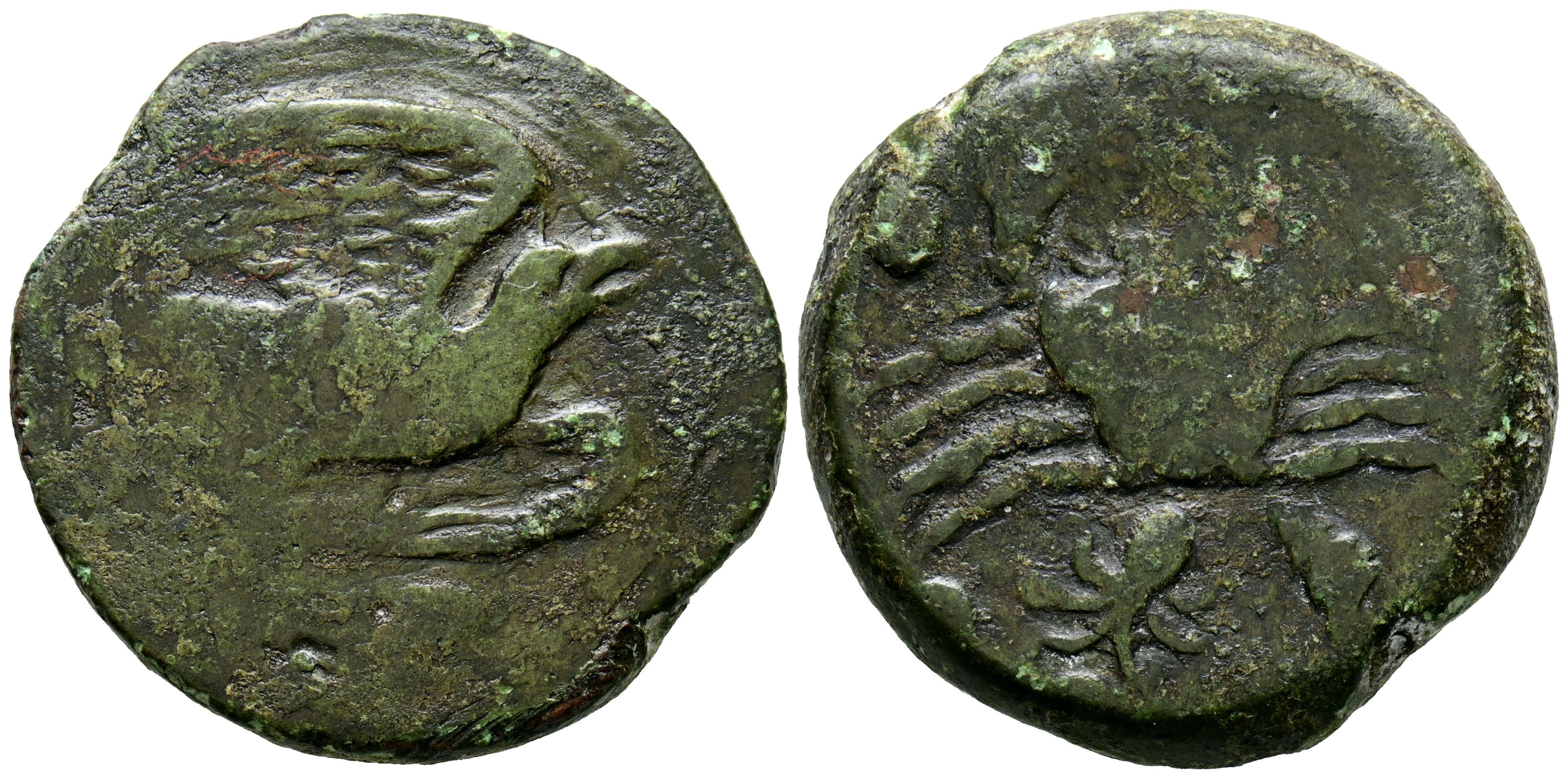 SICILIA, Akragas. Hemilitron. (Ae. 16,33g/28mm). 415-406 a.C. (SNG ANS 1030-1; HGC 2, 134). Anv: Aguila estante a derecha sobre atún. Rev: Cangrejo, debajo concha y pulpo, alrededor seis puntos. MBC-.
