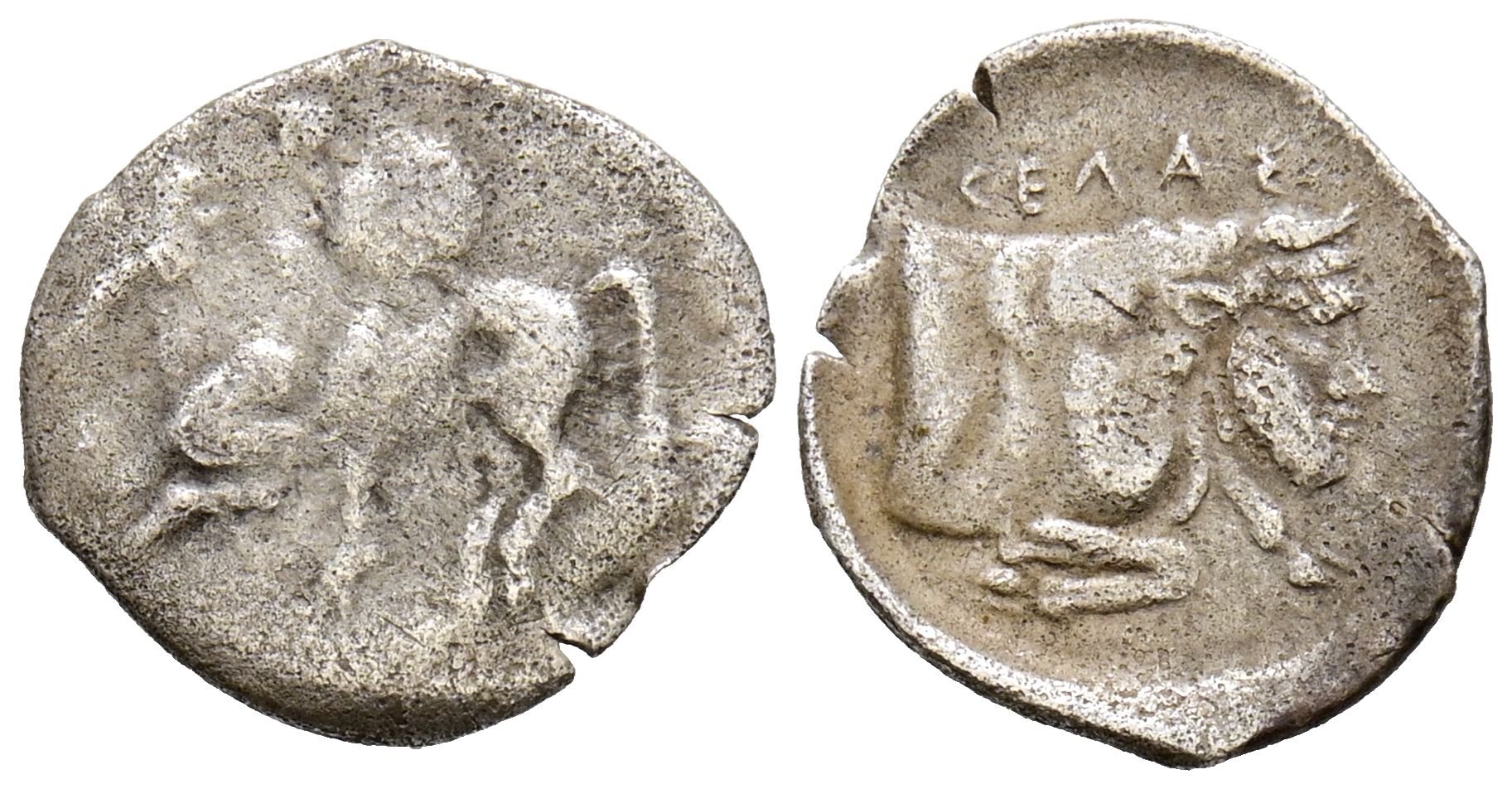 SICILIA, Gela. Litra. (Ar. 0,64g/13mm). 430-425 a.C. (HGC 2, 374; SNG ANS 82). Anv: Jinete con escudo y lanza a izquierda. Rev: Parte delantera de toro a derecha con cabeza del dios Gela, encima leyenda griega: CE?AS. MBC.