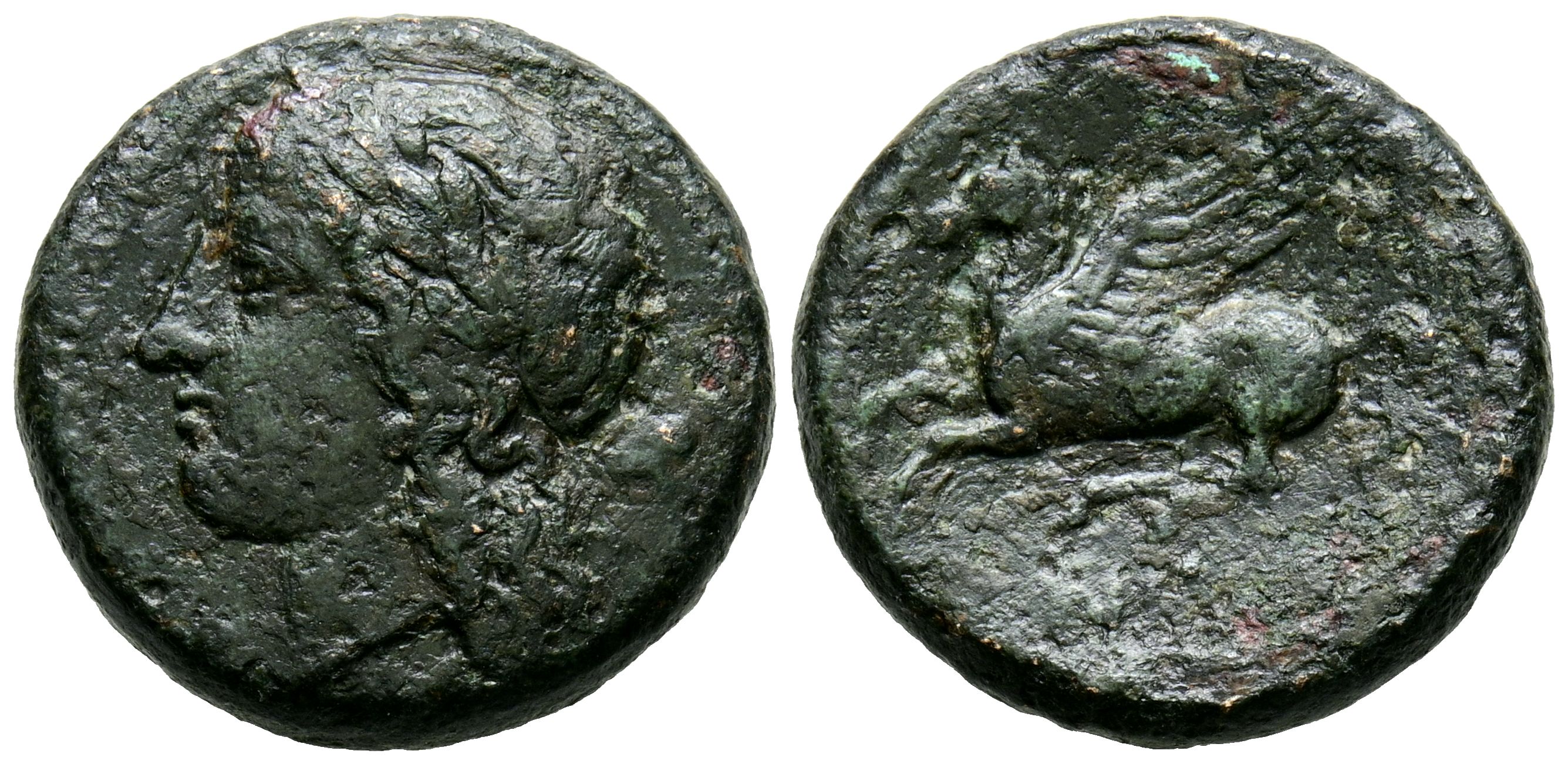 SICILIA, Siracusa. Ae19. (Ae. 5,95g/19mm). 269-240 a.C. (HGC 2, 1551). Anv: Cabeza femenina diademada a izquierda. Rev: Pegaso a izquierda. MBC.