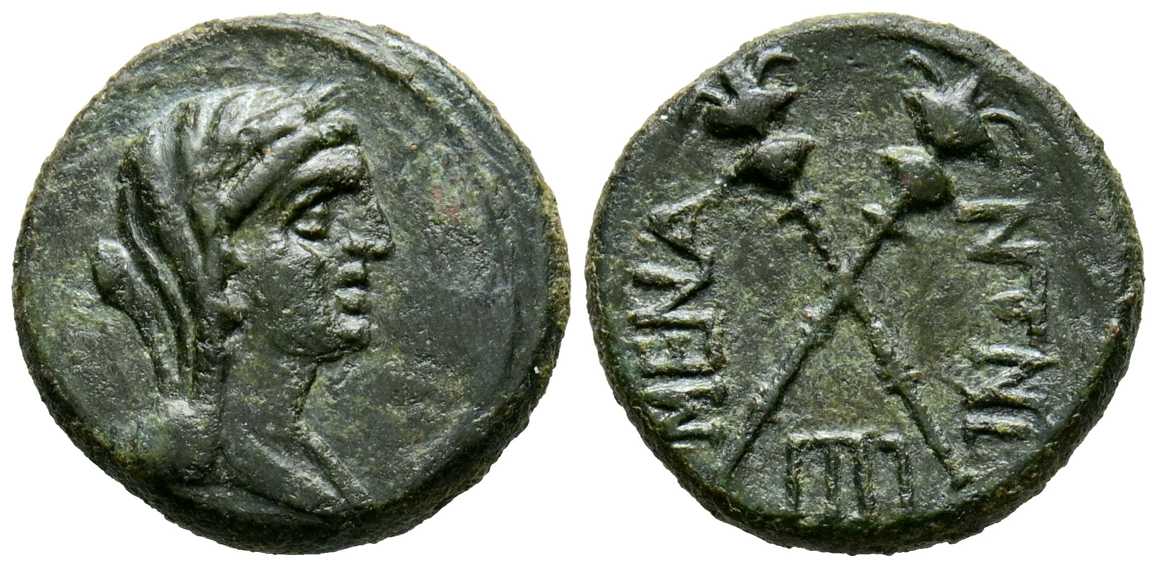 SICILIA, Menaion. Trias. (Ae. 3,11g/16mm). 200-150 a.C. (HGC 2, 760). Anv: Cabeza velada de Demeter a derecha. Rev: Antorchas cruzadas, debajo: IIII, alrededor leyenda: MENAINΩΝ. MBC+.