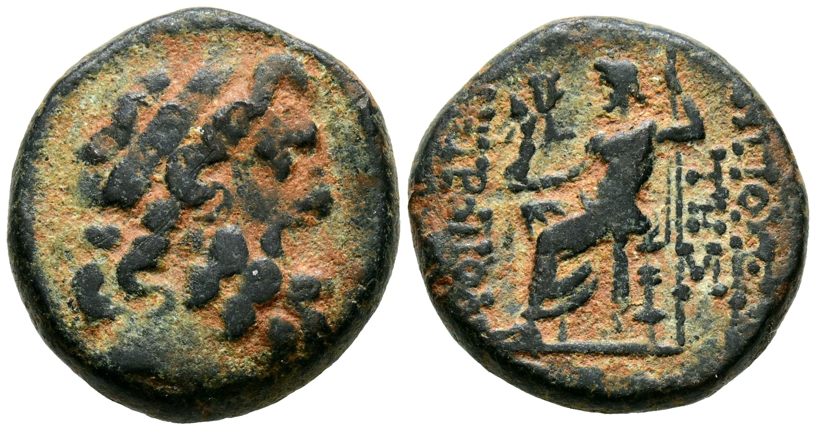 SIRIA, Seleucis y Pieria. Ae20. (Ae. 8,98g/20mm). Siglo I a.C. Antioquía. (HGC 9, 1370). Anv: Cabeza laureada de Zeus a derecha. Rev: Zeus entronizado a izquierda con Nike con corona de laurel, alrededor leyenda: ANTIOXΕΩN THΣ MHTPOΠOΛEΩΣ. MBC-.