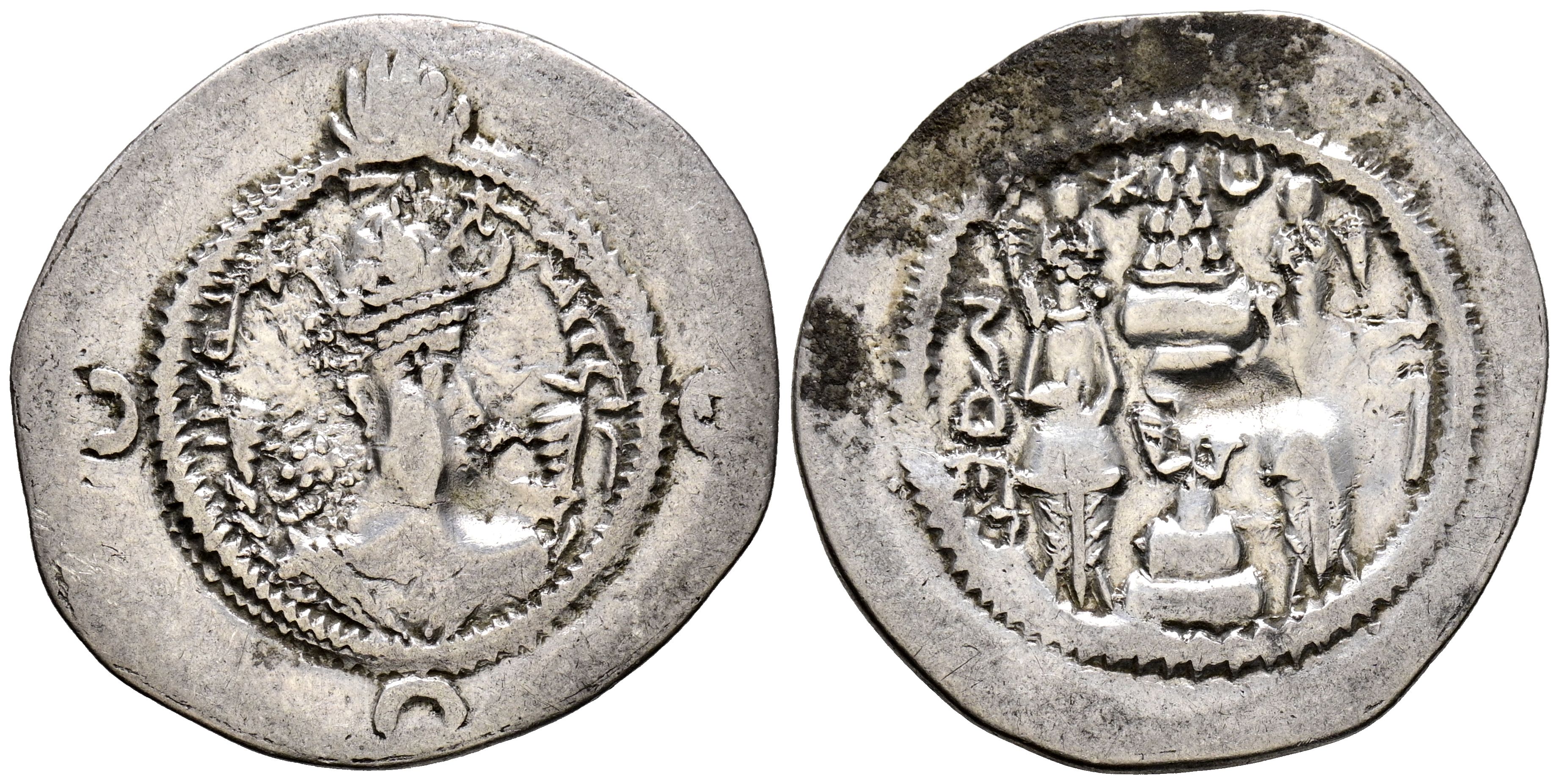 IMPERIO SASANIDA, Khusro I. Dracma. (Ar. 3,02g/27mm). Año 13 de reinado/543 d.C. KA (¿Karzi?). (Göbl-SN II/2). Anv: Busto coronado y drapeado de Khusro I a derecha, alrededor leyenda en palavhi: a la derecha, ABZUD (Crecimiento) y a la izquierda, GDH (Explendor) todo dentro de gráfila circular. En el exterior, a las 3h, 6h y 9h, creciente. Rev: Altar de fuego flanqueado por dos sacerdotes, a la derecha ceca: KA, y a izquierda año de acuñación: 13, todo dentro de gráfila circular. MBC+. Restos de brillo original.