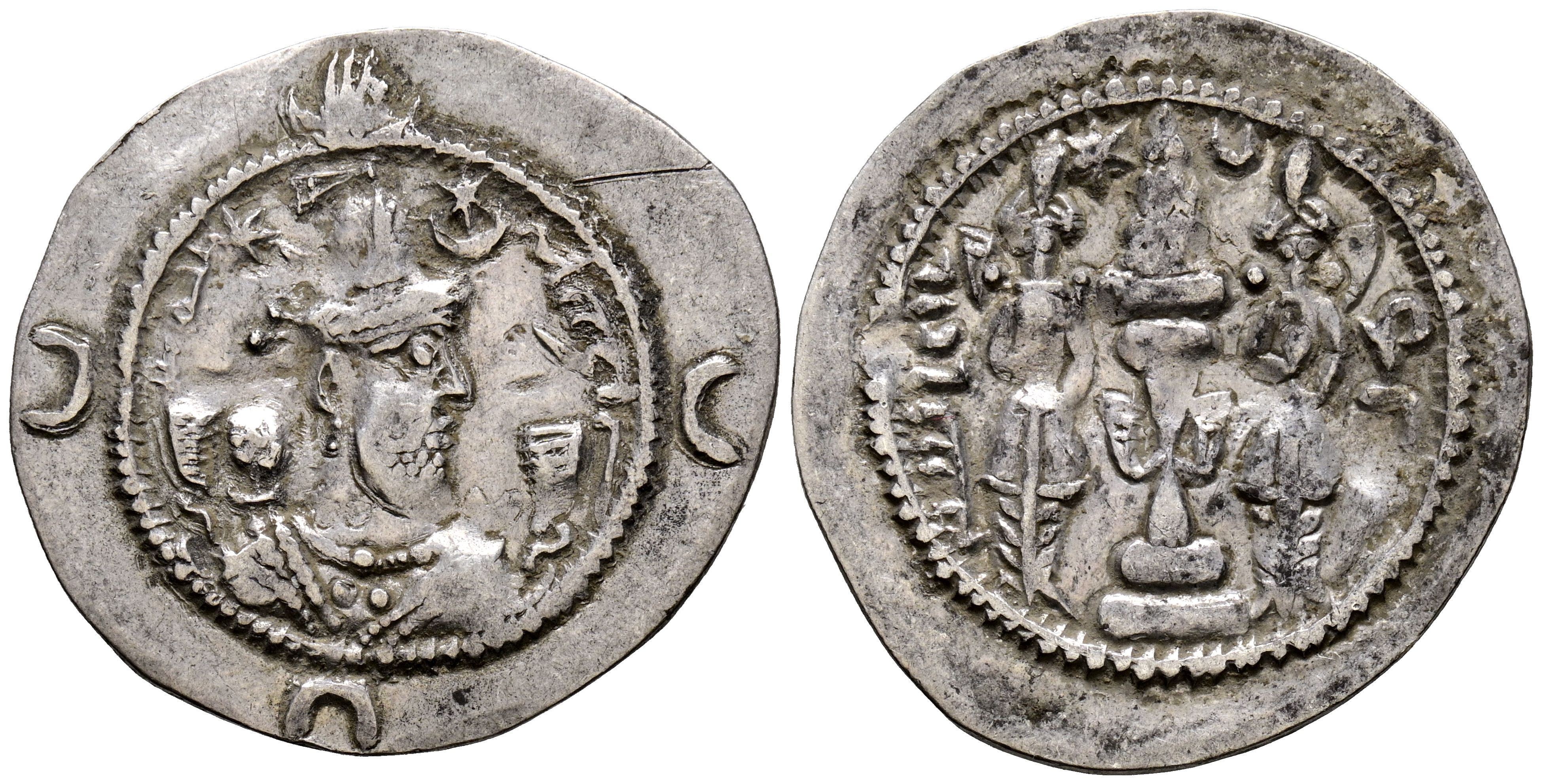 IMPERIO SASANIDA, Khusro I. Dracma. (Ar. 3,09g/28mm). Año 39 de reinado/569 d.C. MY (Meshan). (Göbl-SN II/2). Anv: Busto coronado y drapeado de Khusro I a derecha, alrededor leyenda en palavhi: a la derecha, ABZUD (Crecimiento) y a la izquierda, GDH (Explendor) todo dentro de gráfila circular. En el exterior, a las 3h, 6h y 9h, creciente. Rev: Altar de fuego flanqueado por dos sacerdotes, a la derecha ceca: MY, y a izquierda año de acuñación: 46, todo dentro de gráfila circular. MBC+. Restos de brillo original.
