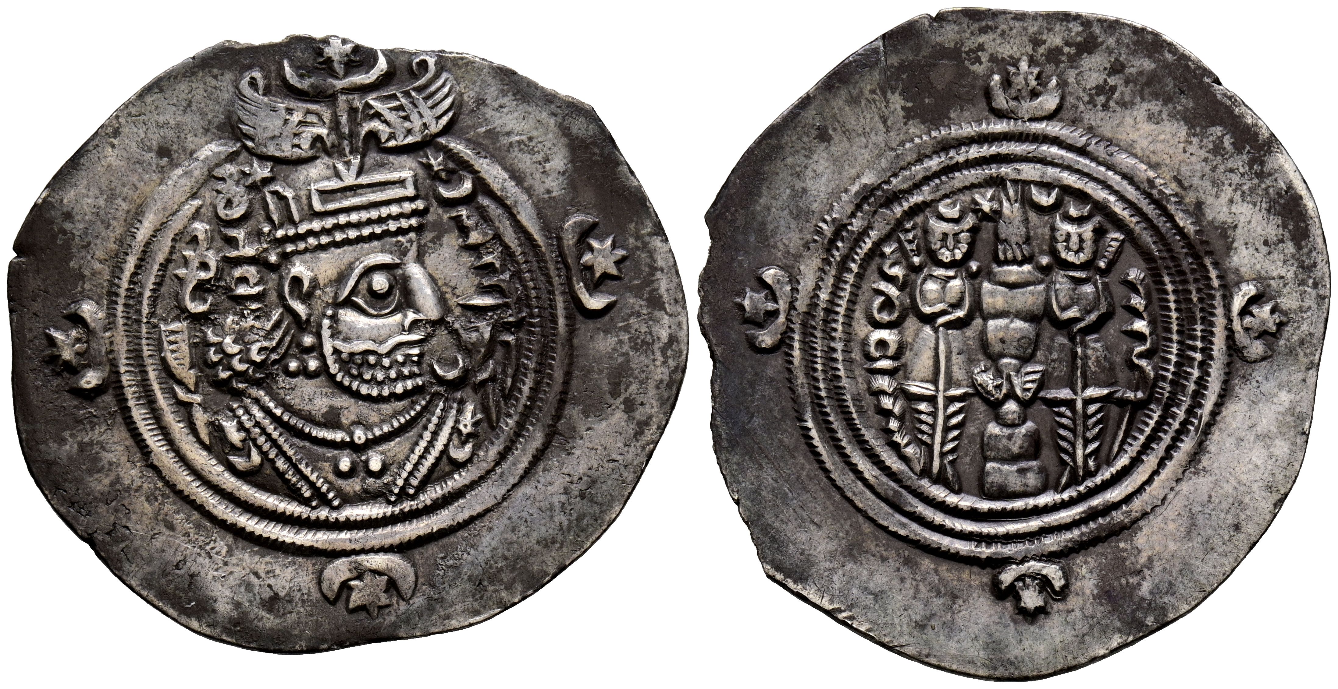 IMPERIO SASANIDA, Khusro II. Dracma. (Ar. 4,01g/32mm). Año 37 PYE/626-7 d.C. ¿AWH? (Hormizd-Ardashir). (Göbl-IIIb/3: Mochiri ENIS II 694). Anv: Busto coronado y drapeado de Khusro II a derecha, alrededor leyenda en palavhi: a la derecha, ABZUD (Crecimiento) y a la izquierda, GDH (Explendor) todo dentro de una doble gráfila circular. En el exterior, a las 3h, 6h y 9h, creciente y estrella. Rev: Altar de fuego flanqueado por dos sacerdotes, a la derecha ceca: AWH, y a izquierda año de acuñación: 37 (Post Yazgard Era) dentro de 3 orlas, en el exterior, a las 12h, 3h, 6h y 9h creciente y estrella. MBC+. Leves falta en cospel. Tono.