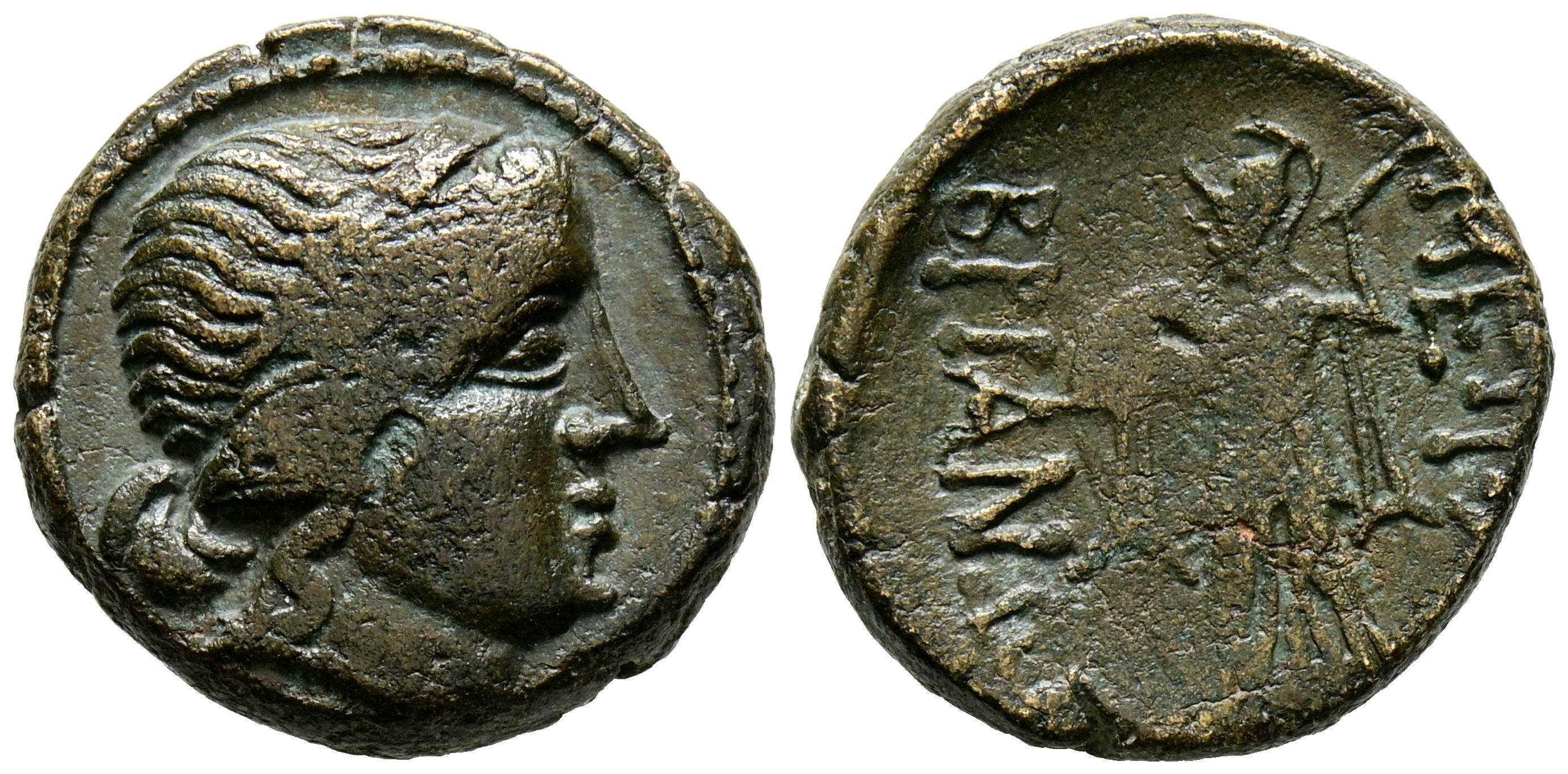 TRACIA, Mesembria. Ae19. (Ae. 6,64g/19mm). 170-100 a.C. (SNG Stancomb 265; HGC 3.2, 1575). Anv: Cabeza femenina diademada a derecha. Rev: Atenas avanzando a izquierda portando lanza y escudo, alrededor leyenda griega: ΜΕΣΑΜ-ΒΡΙΑΝΩΝ. MBC. Limpiada.