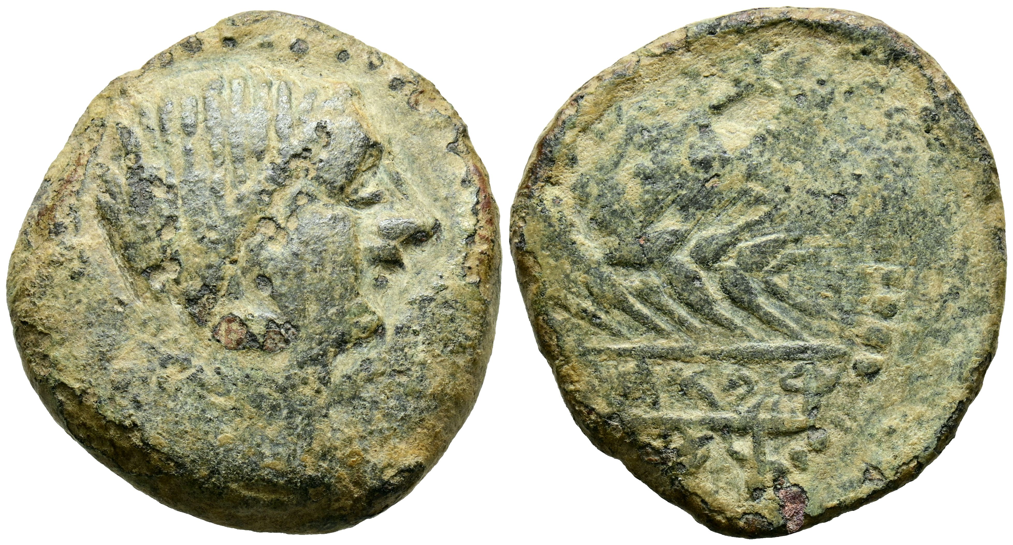ABRA (Zona de Porcuna, Jaén). As. (Ae. 17,71g/29mm). 120-20 a.C. (FAB-30). Anv: Cabeza femenina a derecha, delante leyenda: ABRA. Rev: Espiga y arado, debajo leyenda ibérica retrógrada en dos líneas en cartela: TaKiSniS/TuBoTuKi. MBC-/BC. Escasa.
