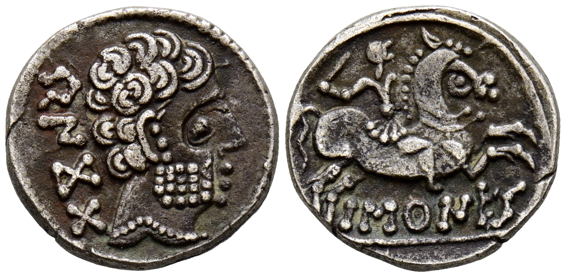 BASCUNES (Pamplona). Denario (Ar. 2,72g/16mm). 120-20 a.C. (FAB-215). Anv: Cabeza masculina barbada a derecha, detrás leyenda ibérica BeNCoDa. Rev: Jinete con espada a derecha, debajo leyenda ibérica BaSCuNES. MBC.