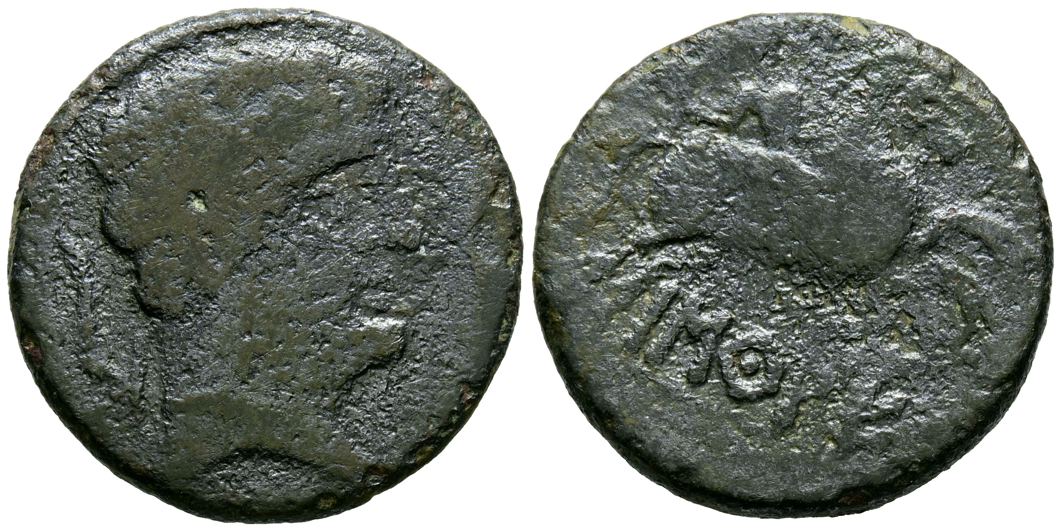 BASCUNES (Pamplona). As. (Ae. 7,11g/24mm). 120-20 a.C. (FAB-217). Anv: Cabeza barbada a derecha, delante delfines y detrás arado. Rev: Jinete con espada a derecha, debajo leyenda ibérica: BaSCUNES. MBC-.