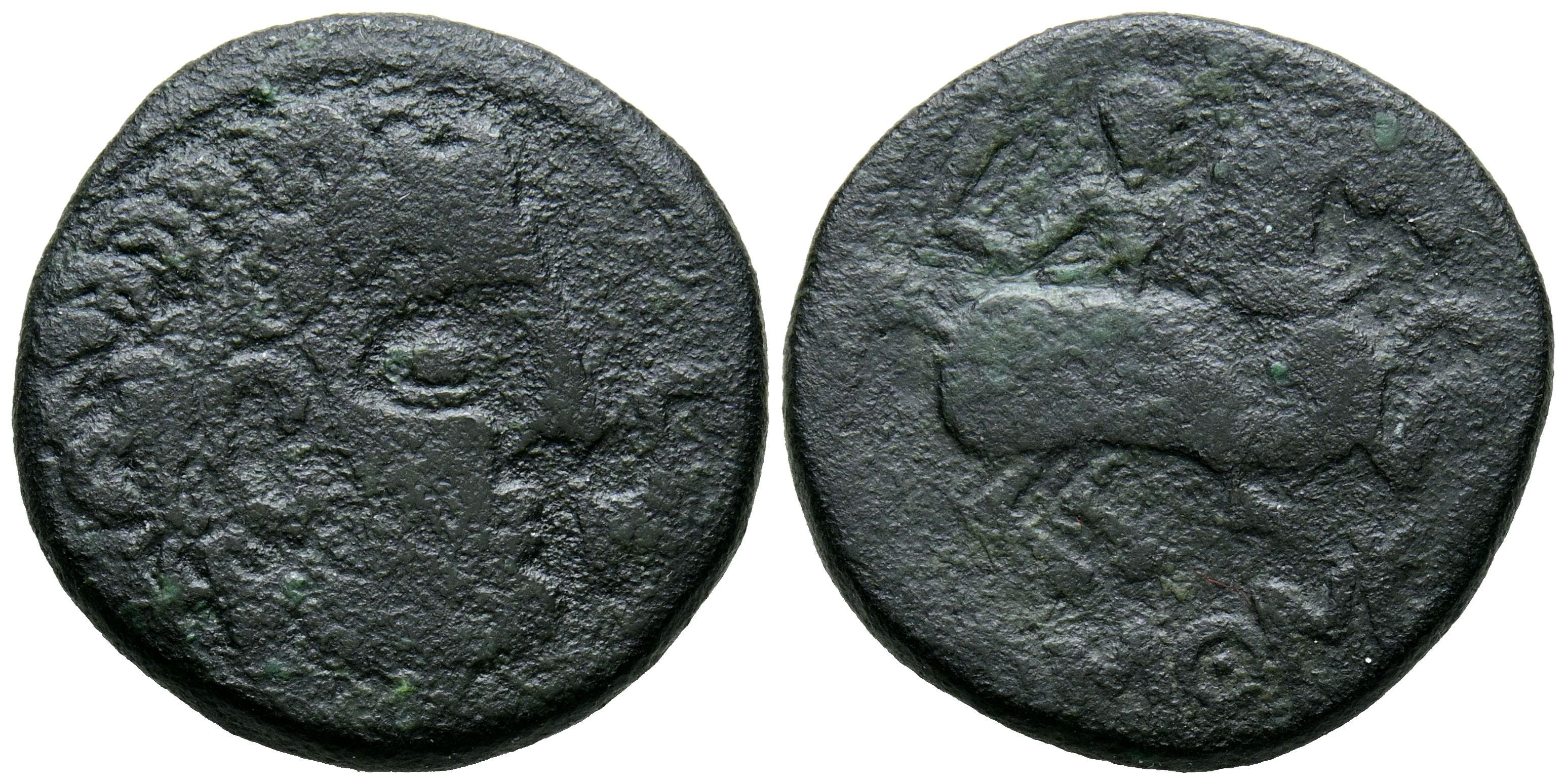 BASCUNES (Pamplona, Navarra). As. (Ae. 7,15g/22mm). 120-20 a.C. (FAB-221). Anv: Cabeza barbada a derecha, detrás leyenda ibérica: BeNCoDa, delante delfín. Rev: Jinete con espada a derecha, debajo leyenda ibérica: BaSCUNES. BC+.