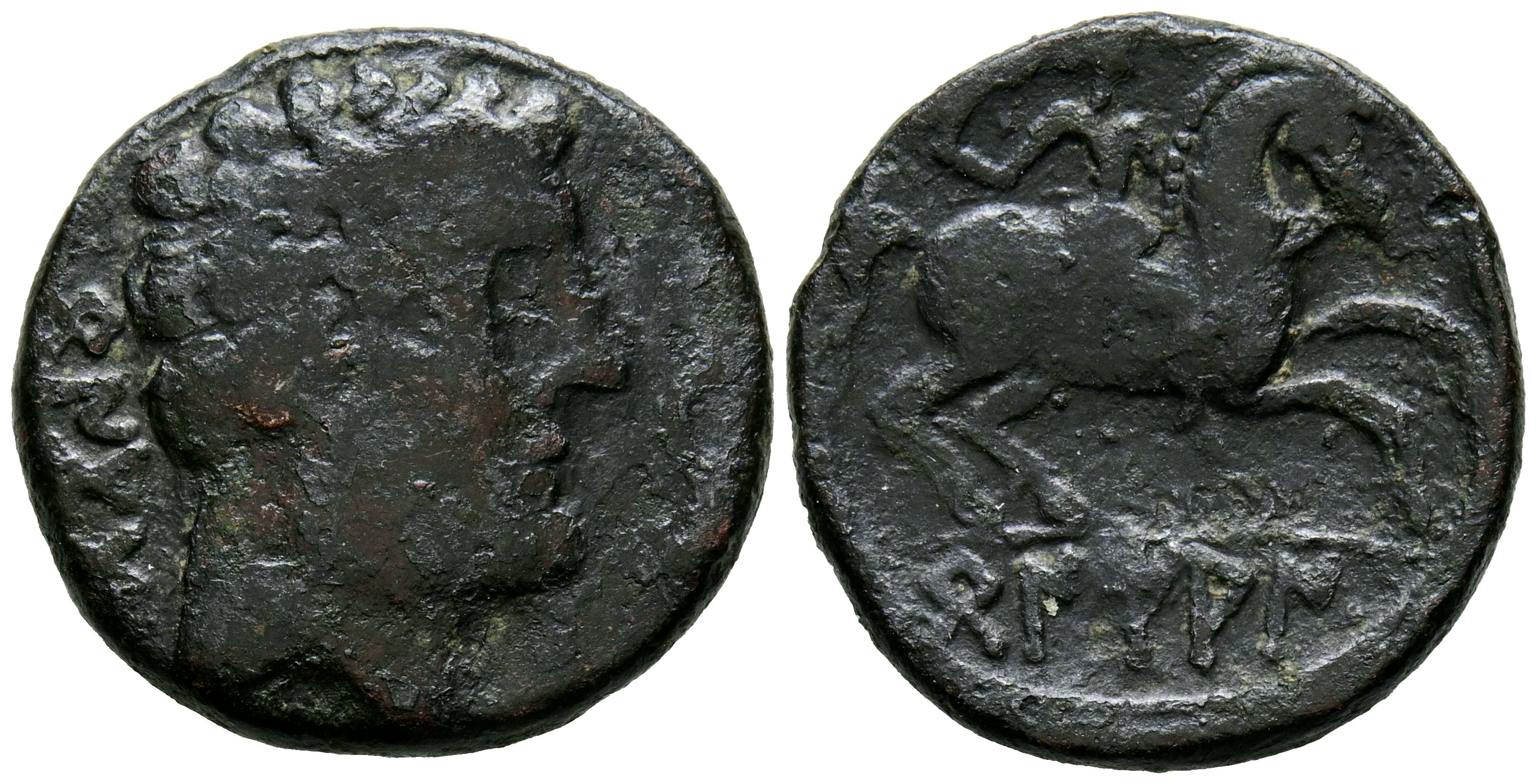 BENTIAN (Zona de Navarra). As. (Ae. 6,82g/22mm). 120-80 a.C. (FAB-250). Anv: Cabeza masculina a derecha, detrás leyenda ibérica: BeNCoDa, delante delfín. Rev: Jinete con espada a derecha, debajo leyenda ibérica: BeNTiAN. MBC-. Escaso.