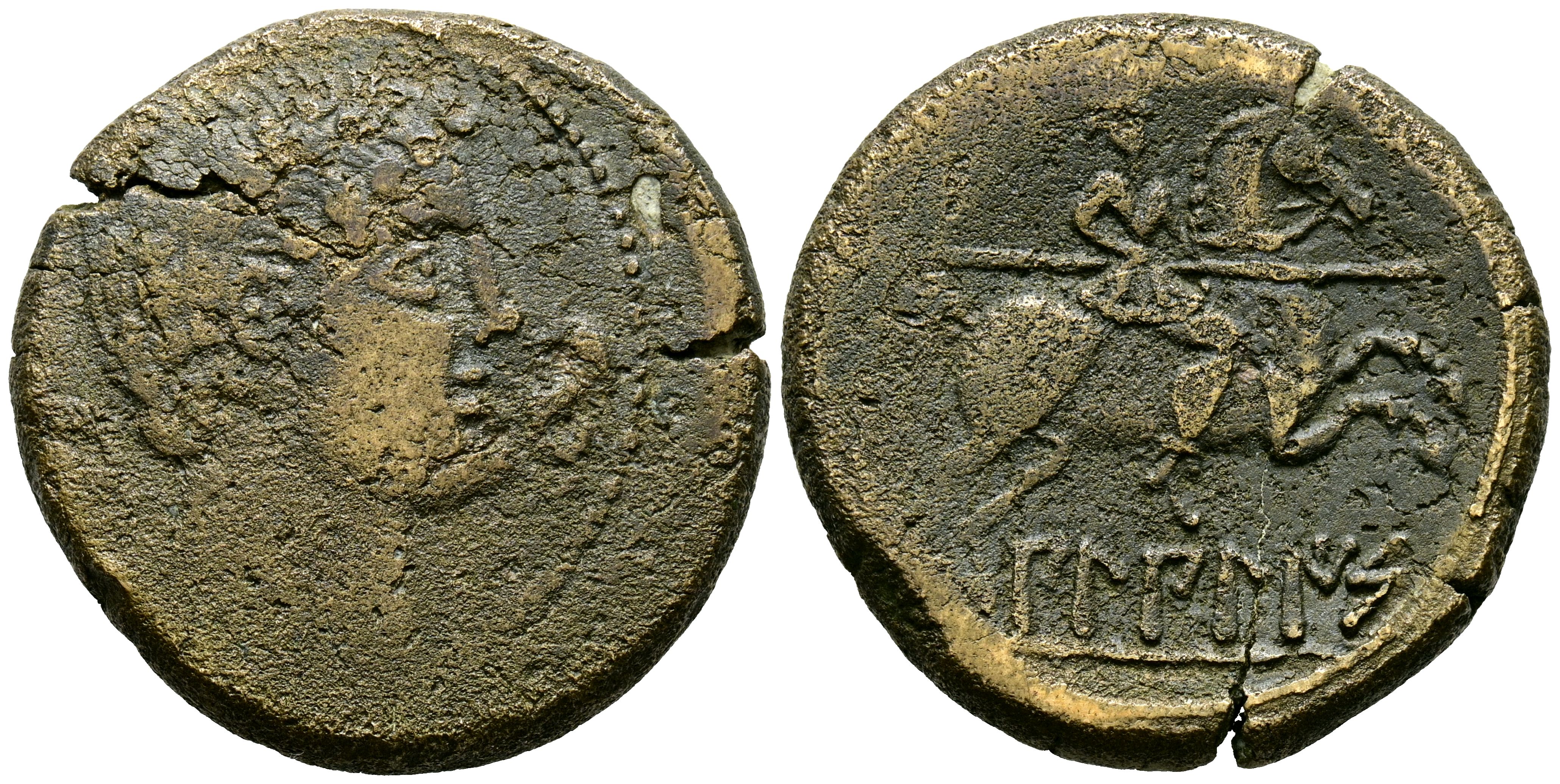 BILBILIS (Calatayud, Zaragoza). As. (Ae. 17,74g/27mm). 120-30 a.C. (FAB-254). Anv: Cabeza masculina a derecha, detrás letra S, delante delfín. Rev: Jinete con lanza a derecha, debajo leyenda ibérica sobre línea: BiLBiLIS. BC+.