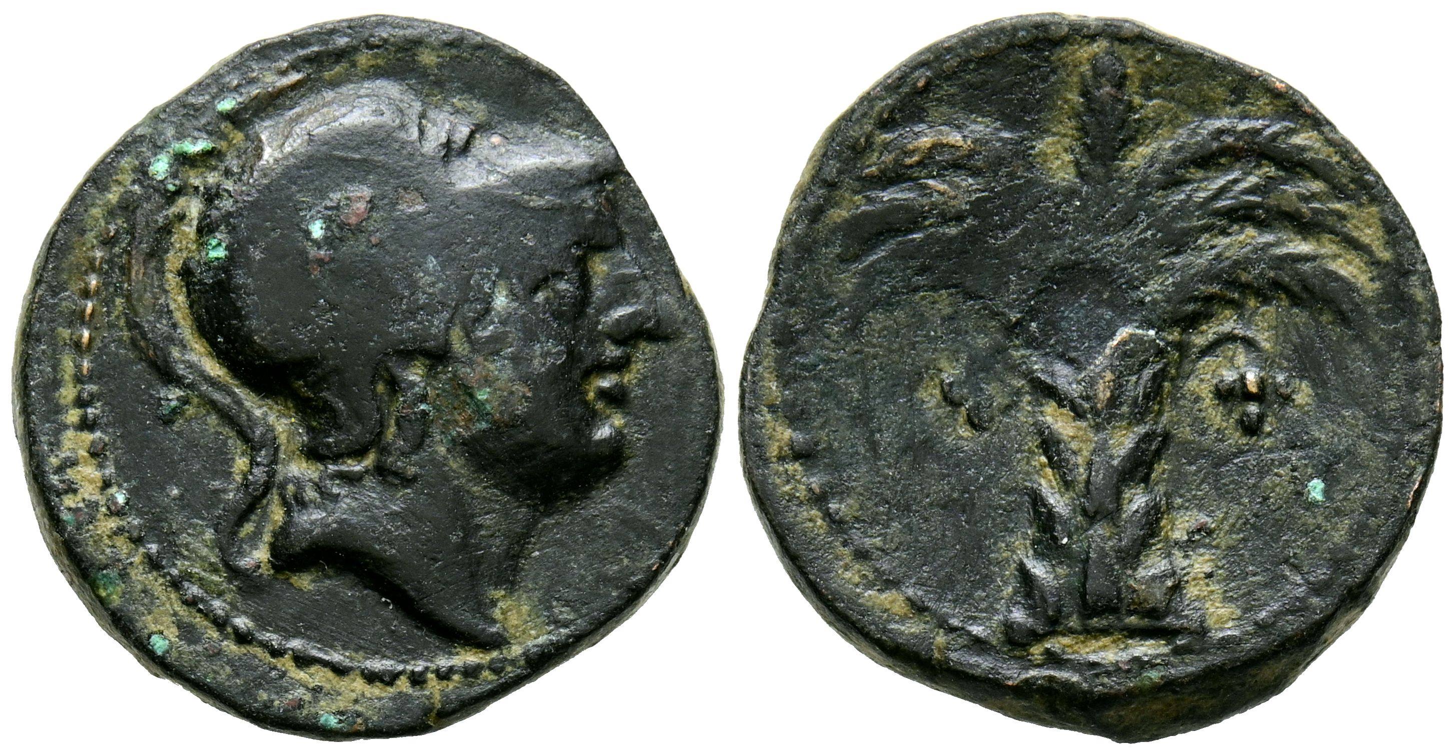 CARTAGONOVA (Cartagena, Murcia). Calco. (Ae. 5,71g/21mm). 220-215 a.C. (FAB-518). Anv: Cabeza de Arles con casco a derecha. Rev: Palmera. MBC-. Oxidaciones.