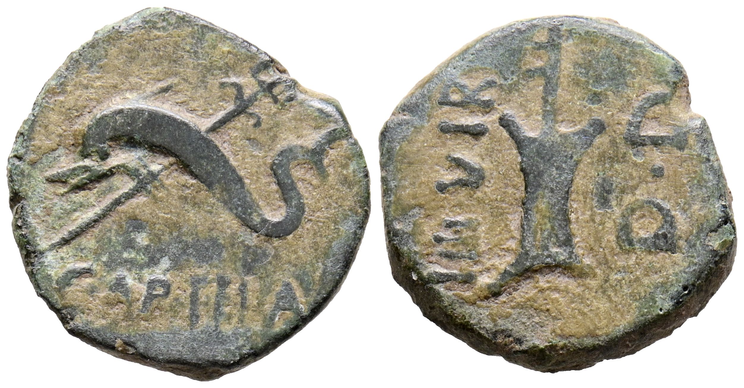 CARTEIA (San Roque, Cádiz). Semis. (Ae. 3,37g/18mm). 27 a.C.-14 d.C. (FAB-683). Anv: Delfín a izquierda, detrás tridente, debajo leyenda: CARTEIA. Rev: Timón a derecha, encima leyenda: IIII VIR, debajo: D D. MBC.