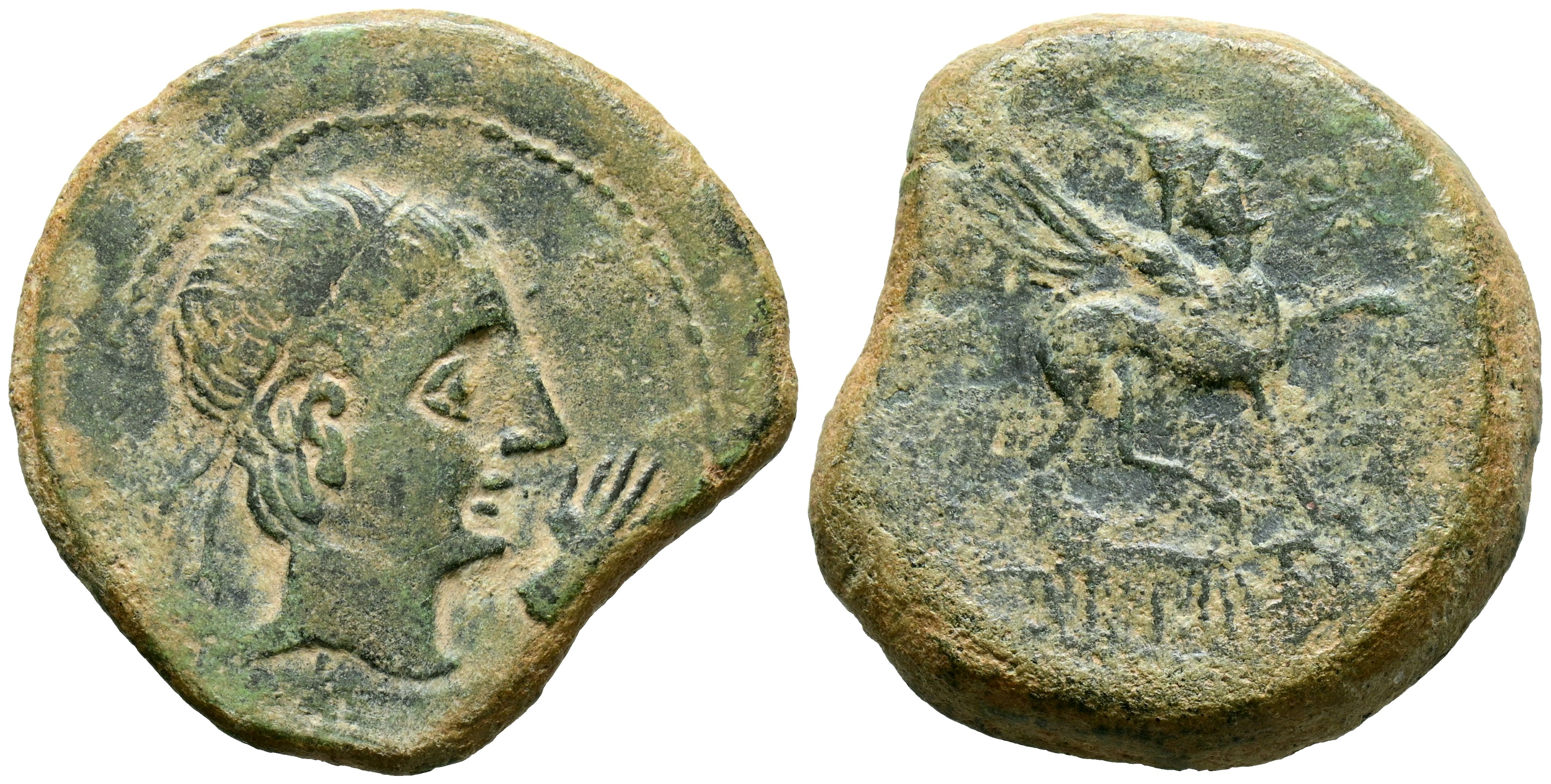CASTULO (Cazlona, Jaén). As. (Ae. 16,41g/30mm). 180 a.C. (FAB-701). Anv: Cabeza masculina diademada a derecha, delante mano. Rev: Esfinge a derecha, delante estrella, debajo de línea leyenda ibérica: CaSTeLE. MBC-. Cospel faltado.