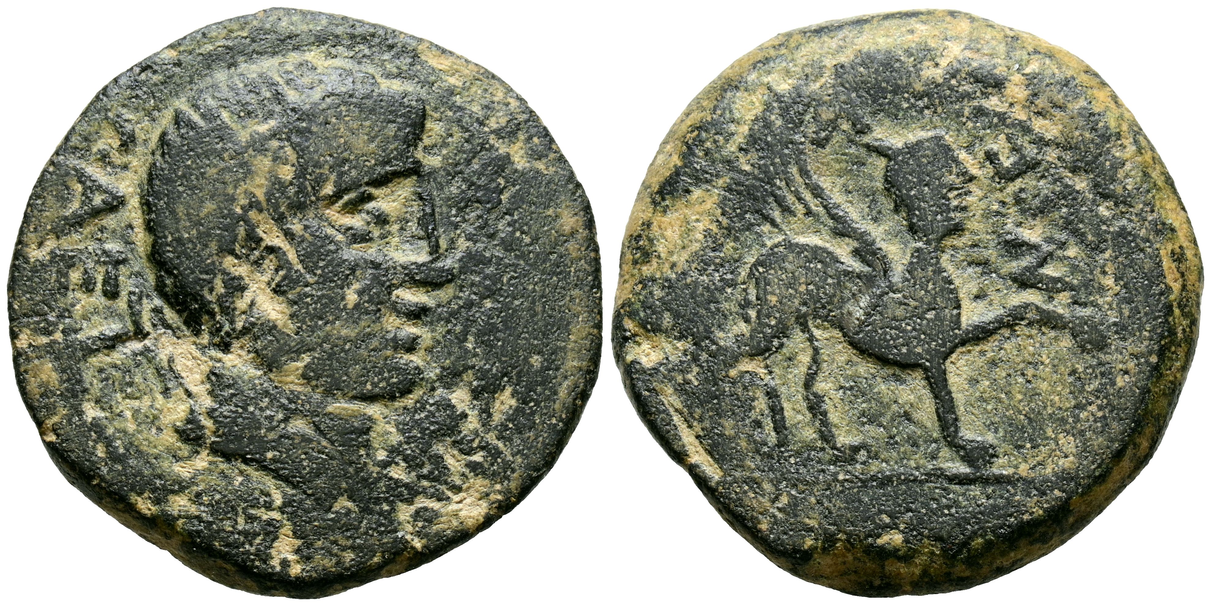 CASTULO (Cazlona, Jaén). As. (Ae. 16,33g/28mm). 180 a.C. (FAB-710). Anv: Cabeza masculina diademada a derecha, alrededor leyenda: C AEL M ISC. Rev: Esfinge a derecha, alrededor leyenda: M FVL. MBC.