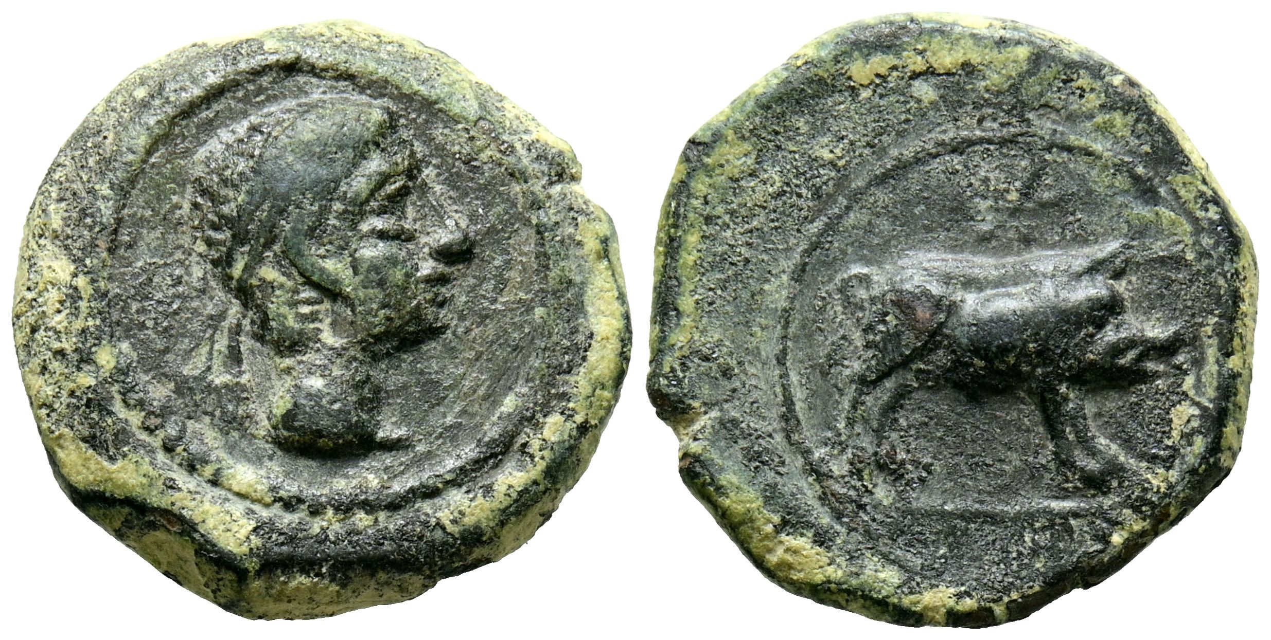 CASTULO (Cazlona, Jaén). Cuadrante. (Ae. 4,01g/17mm). 180 a.C. (FAB-735). Anv: Cabeza masculina diademada a derecha. Rev: Jabalí a derecha, encima estrella, debajo de línea leyenda ibérica: CaSTeLE. MBC.