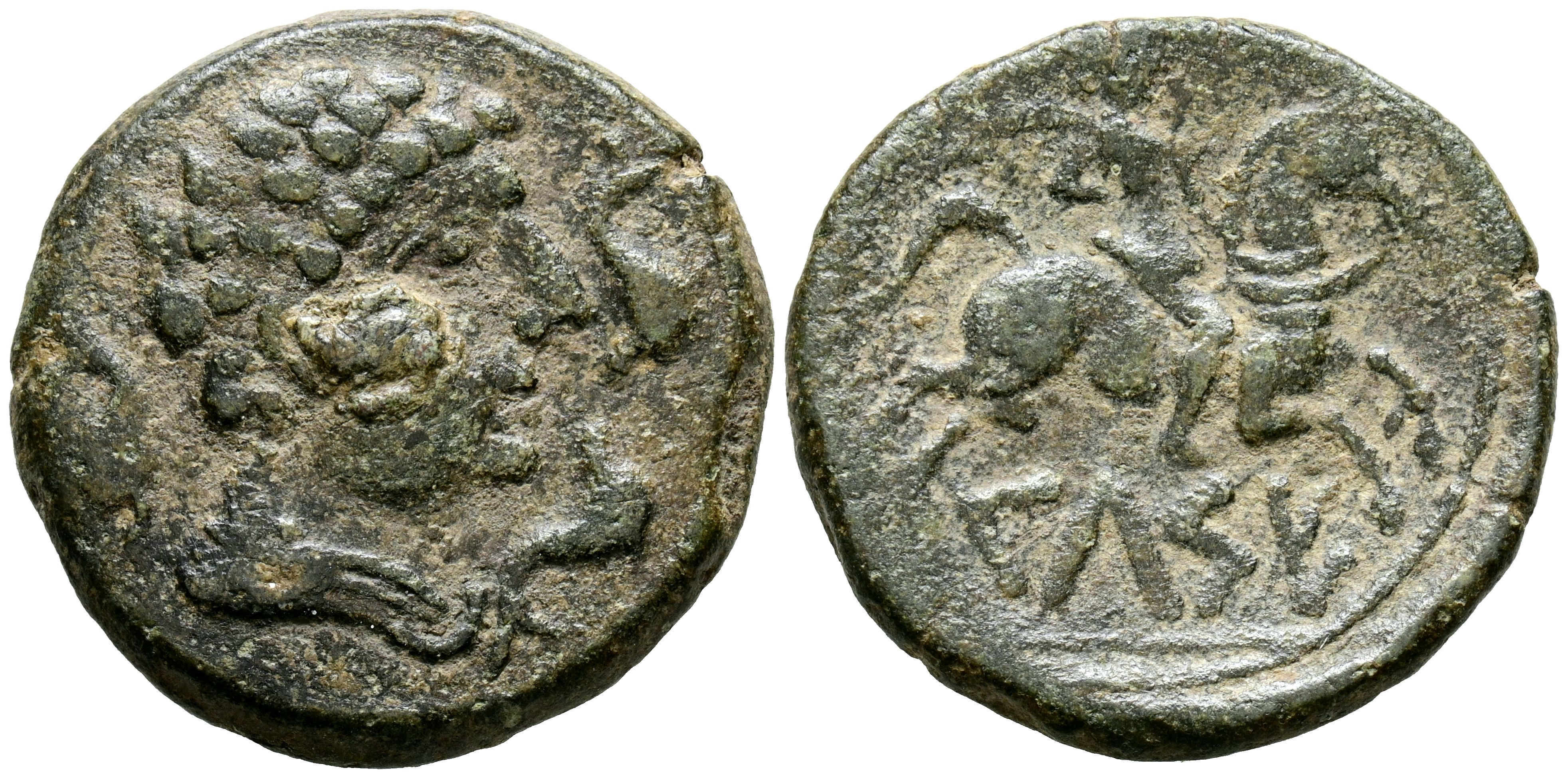 CELSE (Velilla de Ebro, Zaragoza). As. (Ae. 12,13g/27mm). 120-50 a.C. (FAB-771). Anv: Cabeza masculina a derecha con manto y fíbula, alrededor de tres delfines. Rev: Jinete con palma a derecha, debajo leyenda ibérica sobre línea: CeLSE. MBC.