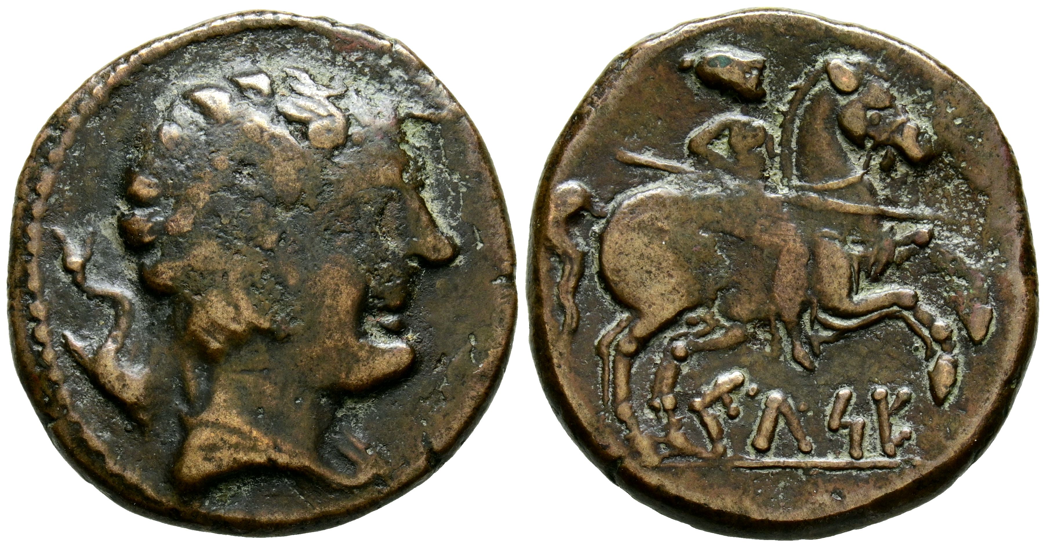 CELSE (Velilla del Ebro, Zaragoza). As. (Ae. 9,90g/26mm). 120-50 a.C. (FAB-778). Anv: Cabeza masculina a derecha, detrás delfín. Rev: Jinete con lanza a derecha, debajo sobre línea leyenda: CeLSE. MBC-. Limpiada.