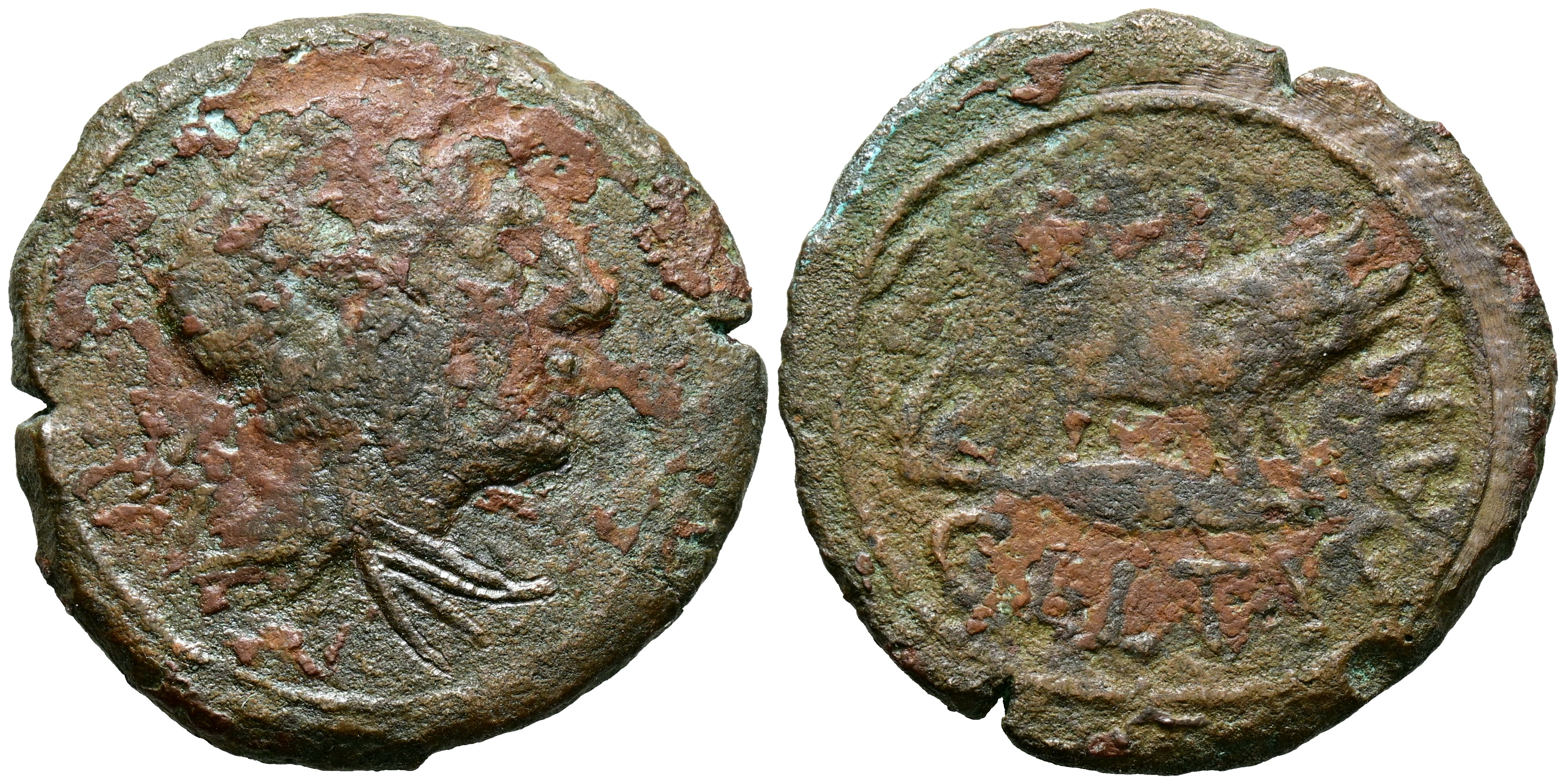 CELTITAN (Peñaflor, Sevilla). As. (Ae. 13,27g/30mm). 50 a.C. (FAB-822). Anv: Cabeza laureada a derecha. Rev: Jabalí a derecha sobre punta de lanza, debajo leyenda: CELTITAN. BC+. Raro.